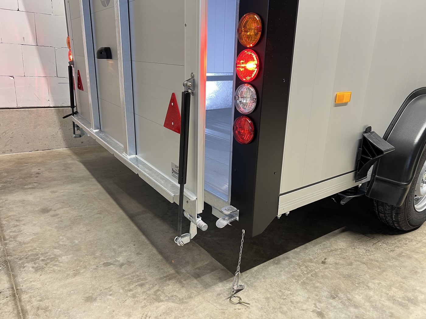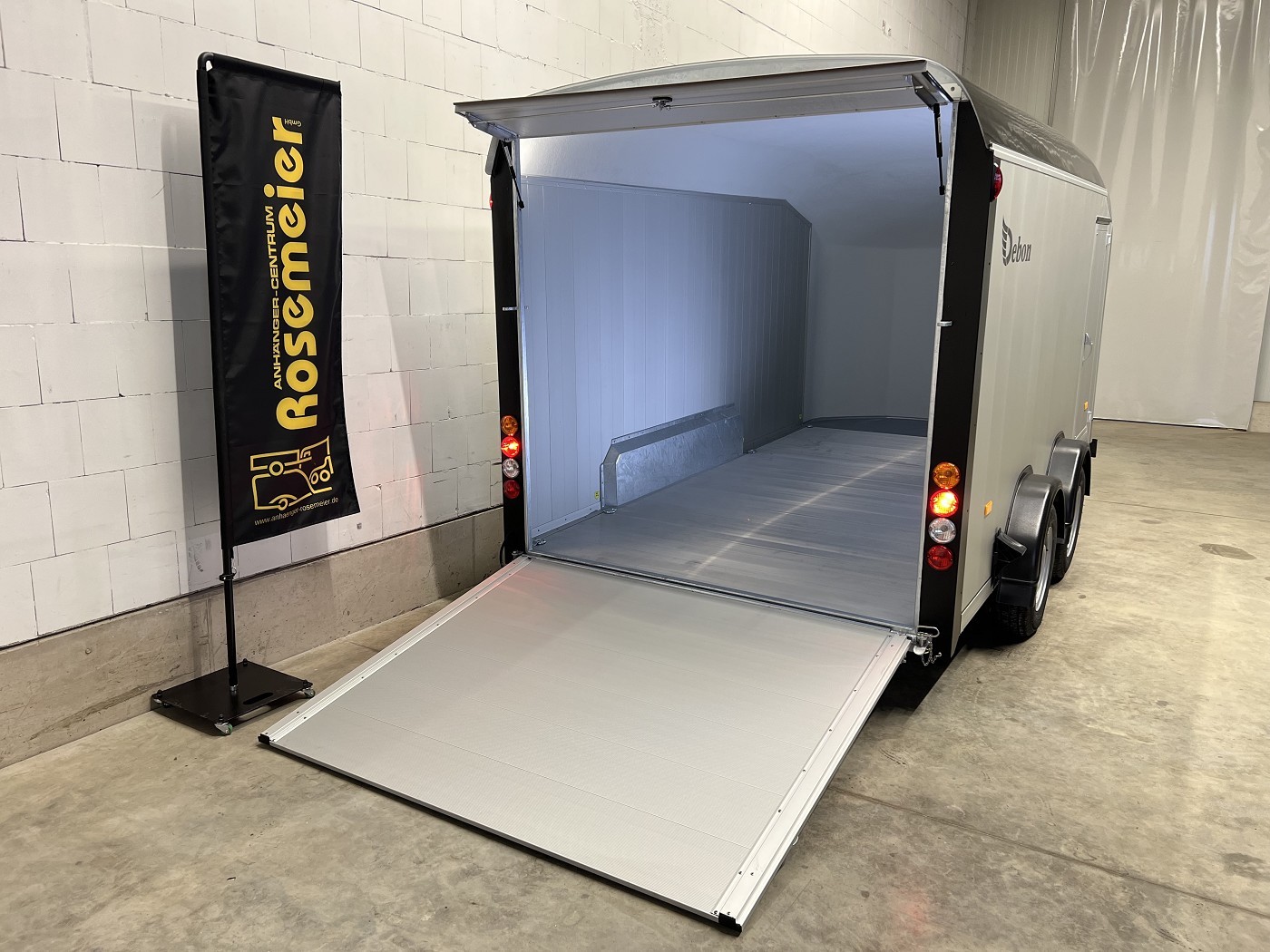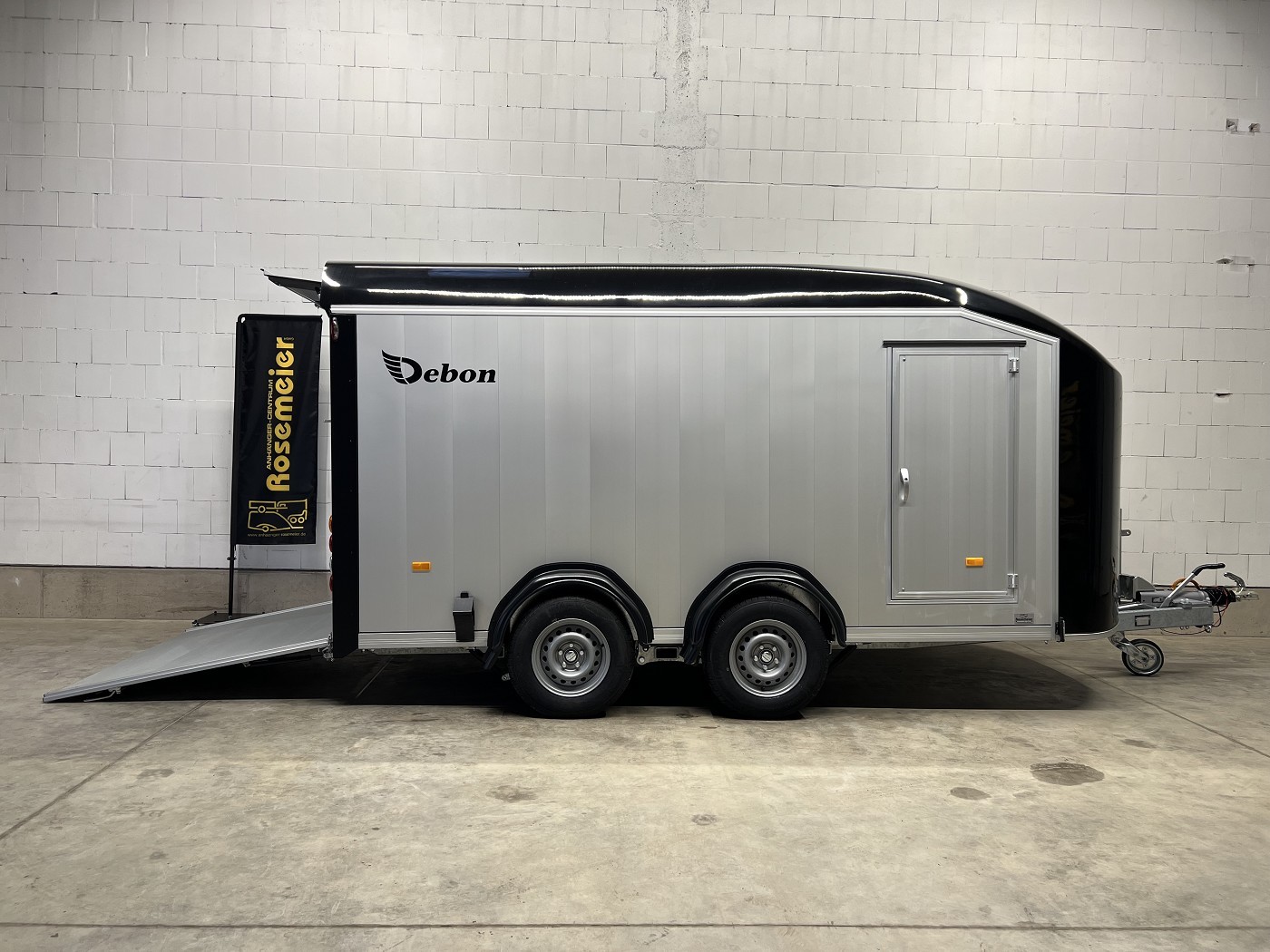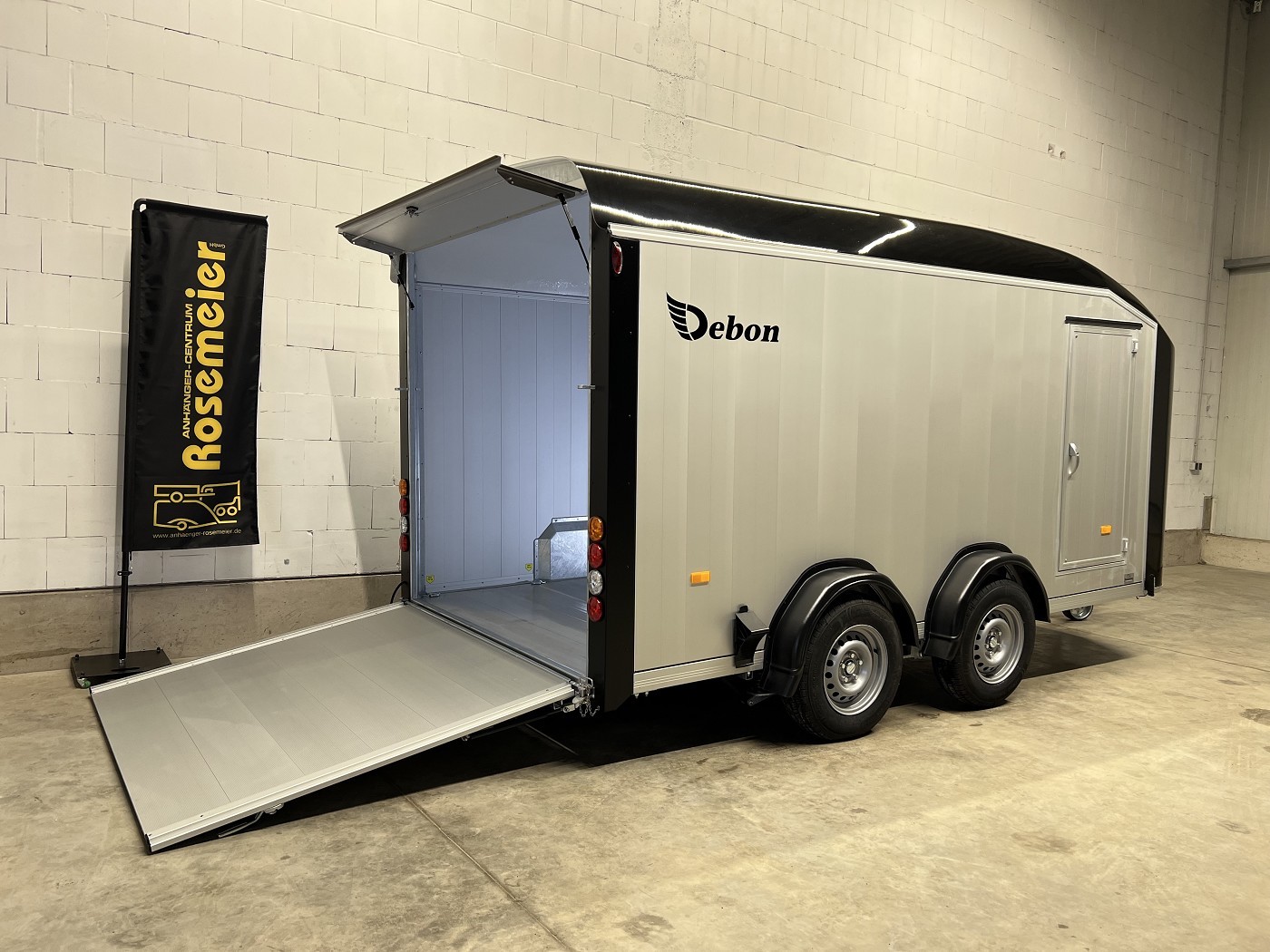 Alu-Kofferanhänger mit seitlicher Einstiegstür und Tür-Rampen-Kombination