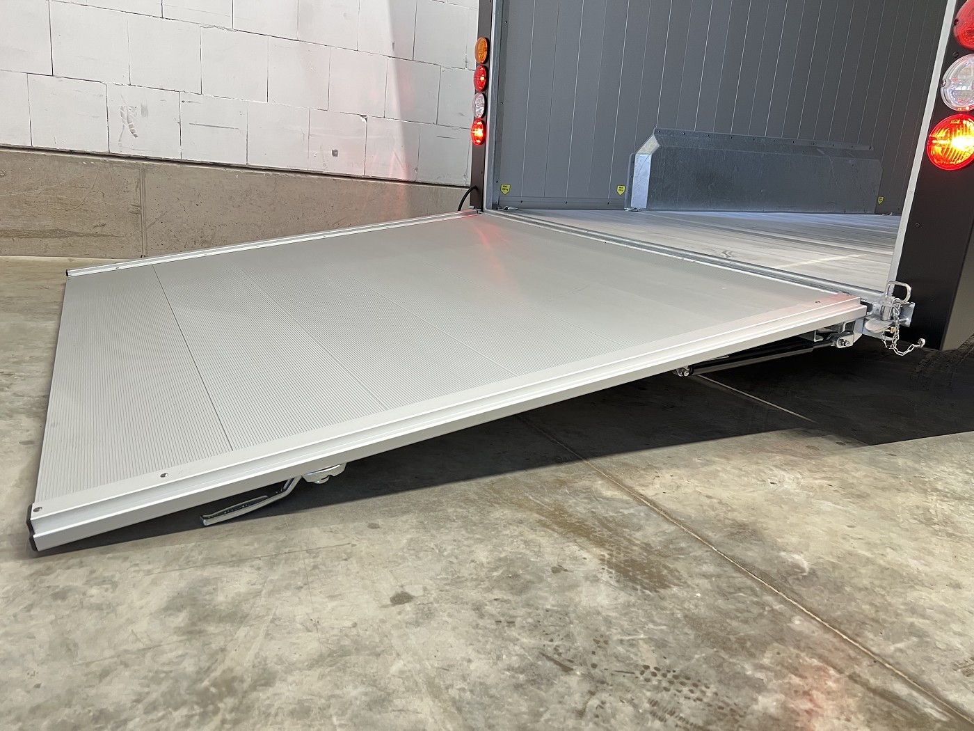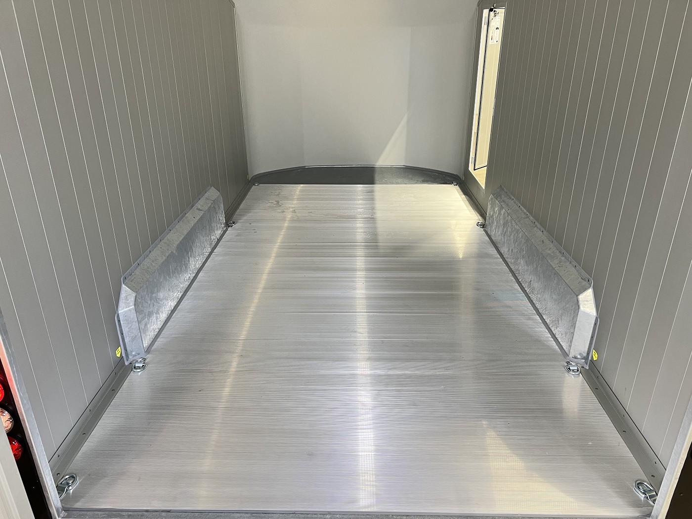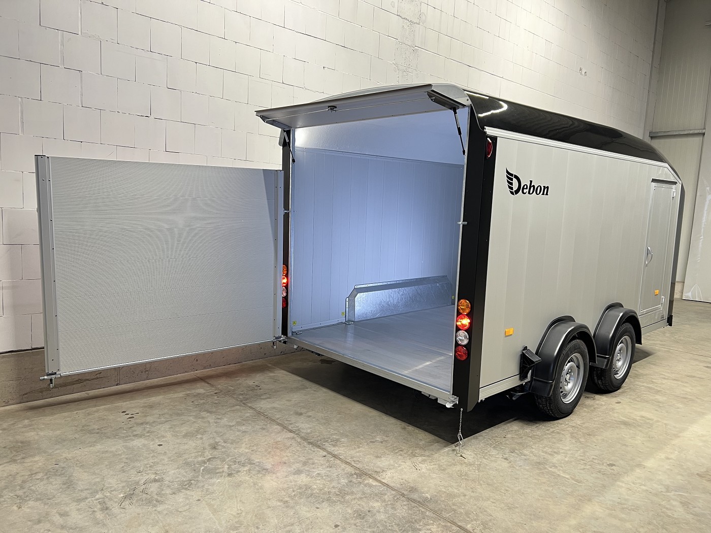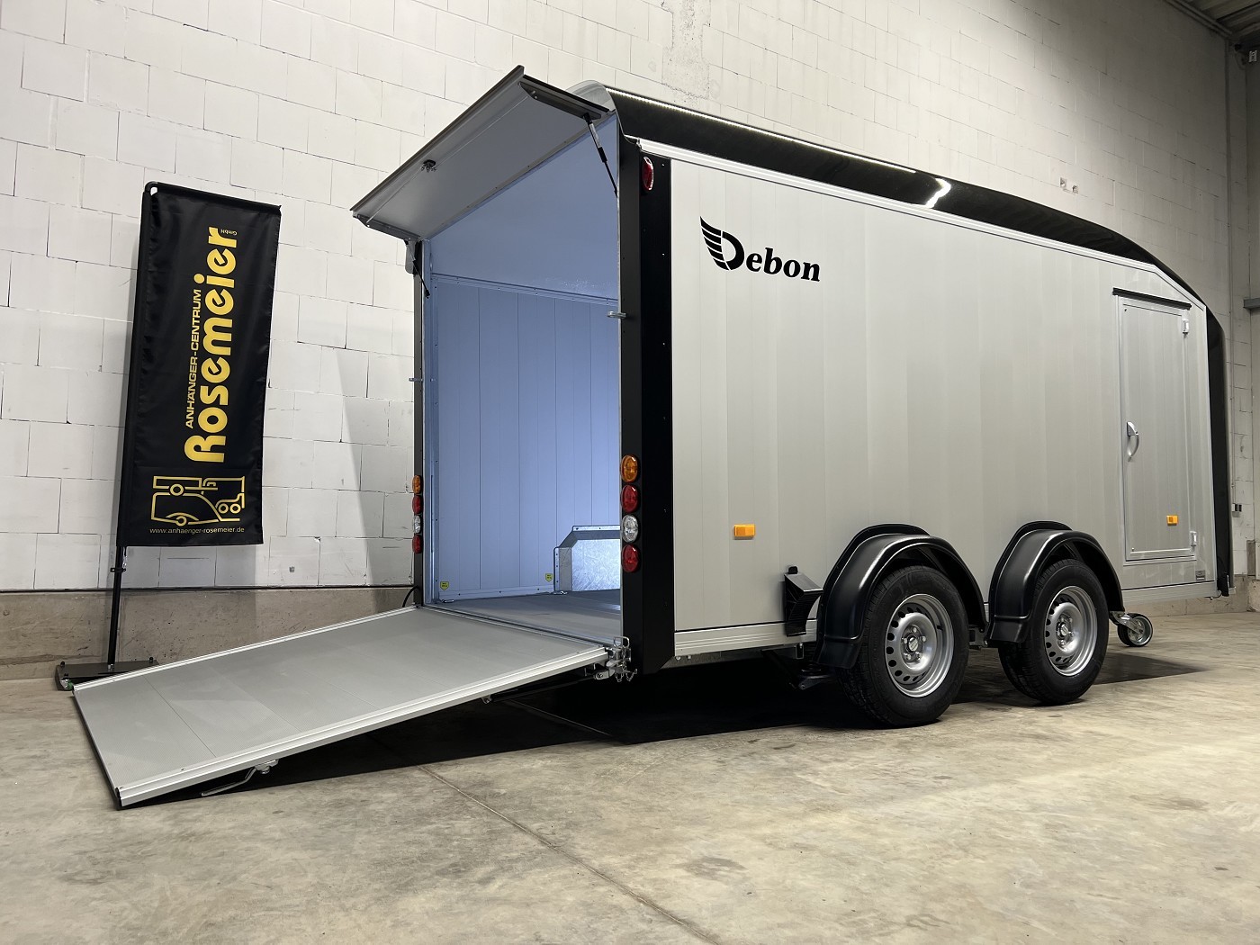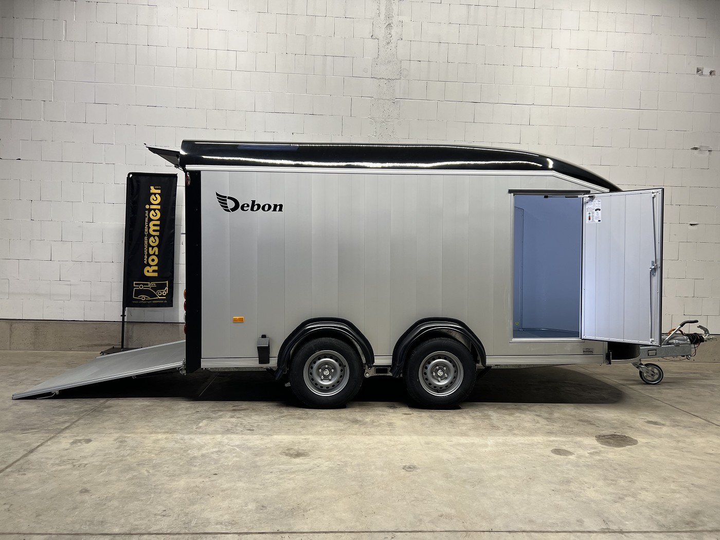 Alu-Kofferanhänger mit seitlicher Einstiegstür und Tür-Rampen-Kombination