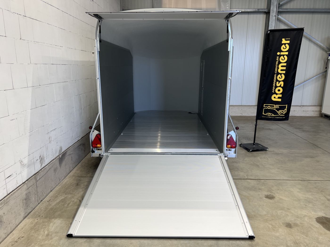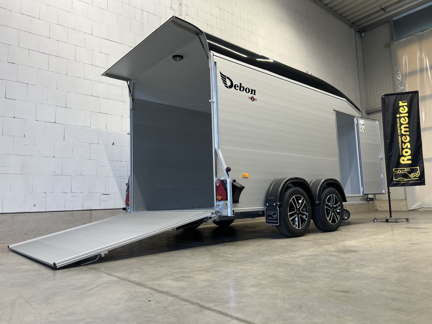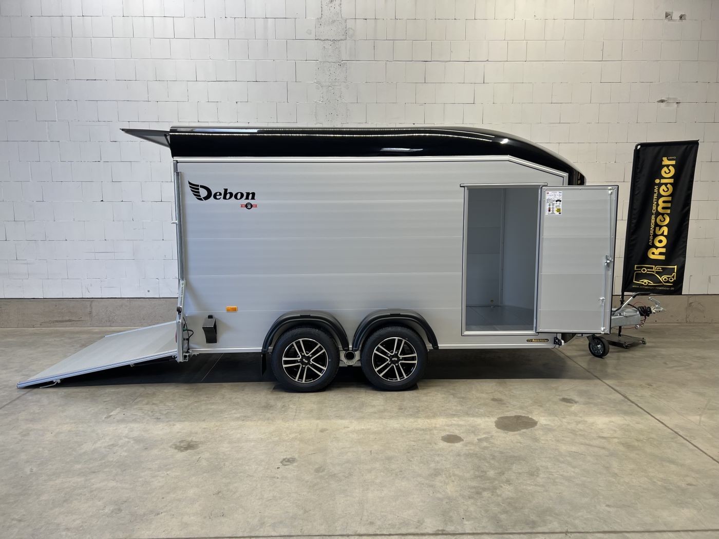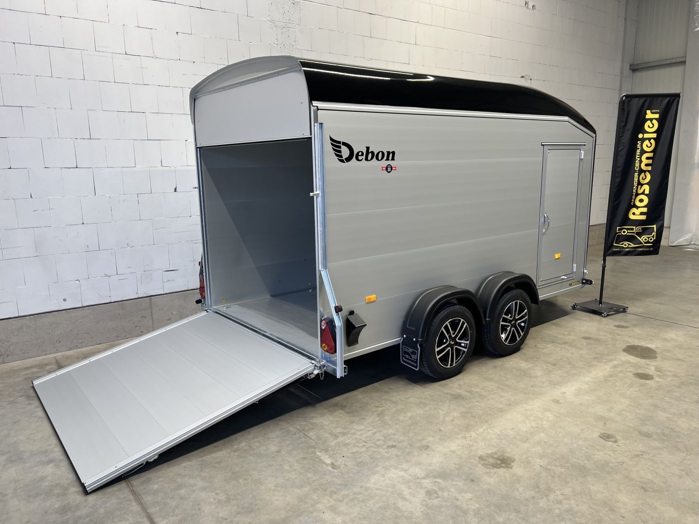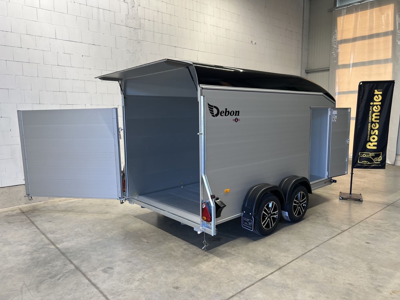 Alu-Kofferanhänger mit seitlicher Einstiegstür und Tür/Rampen-Kombination und Alu-Felgen