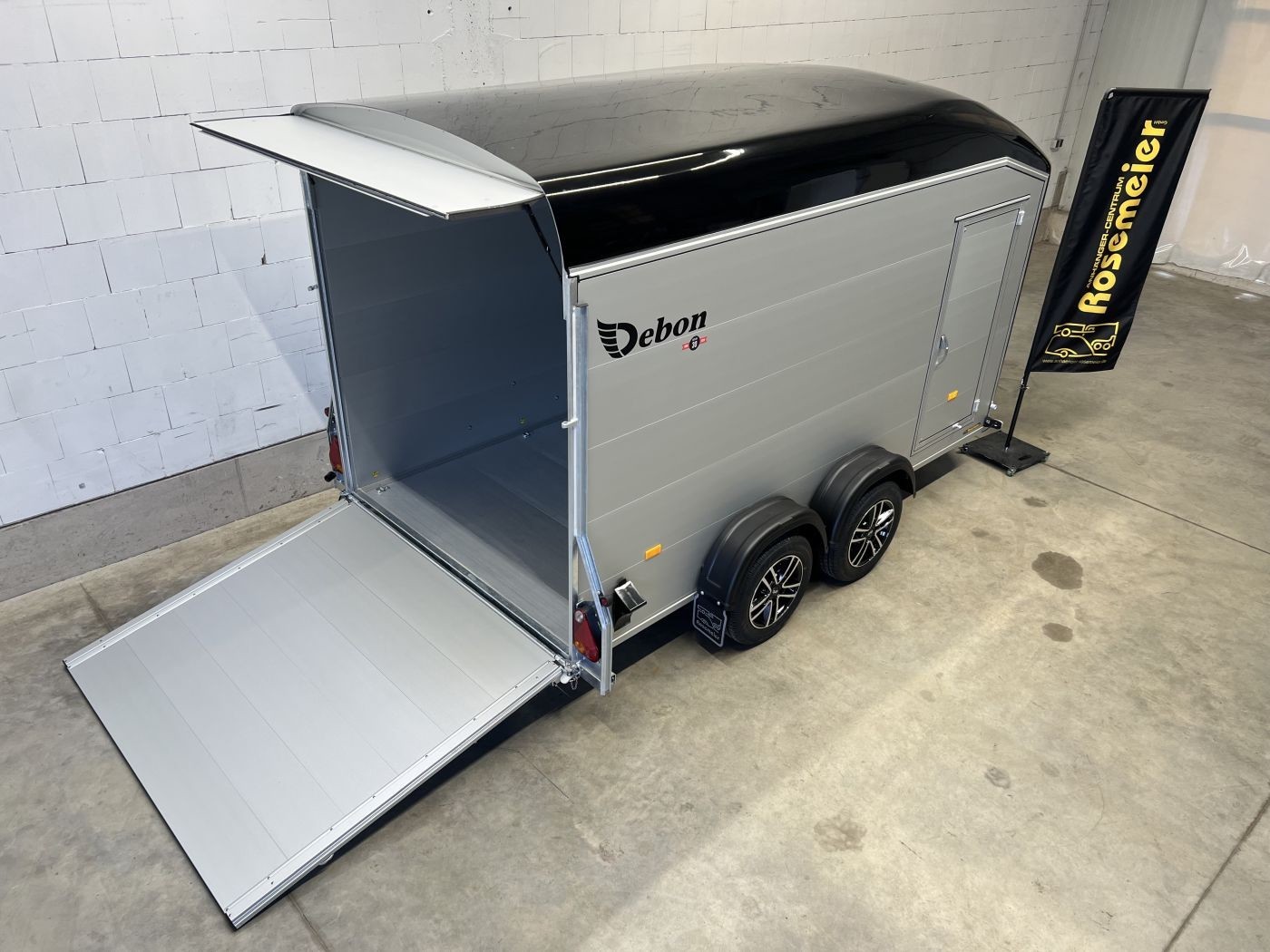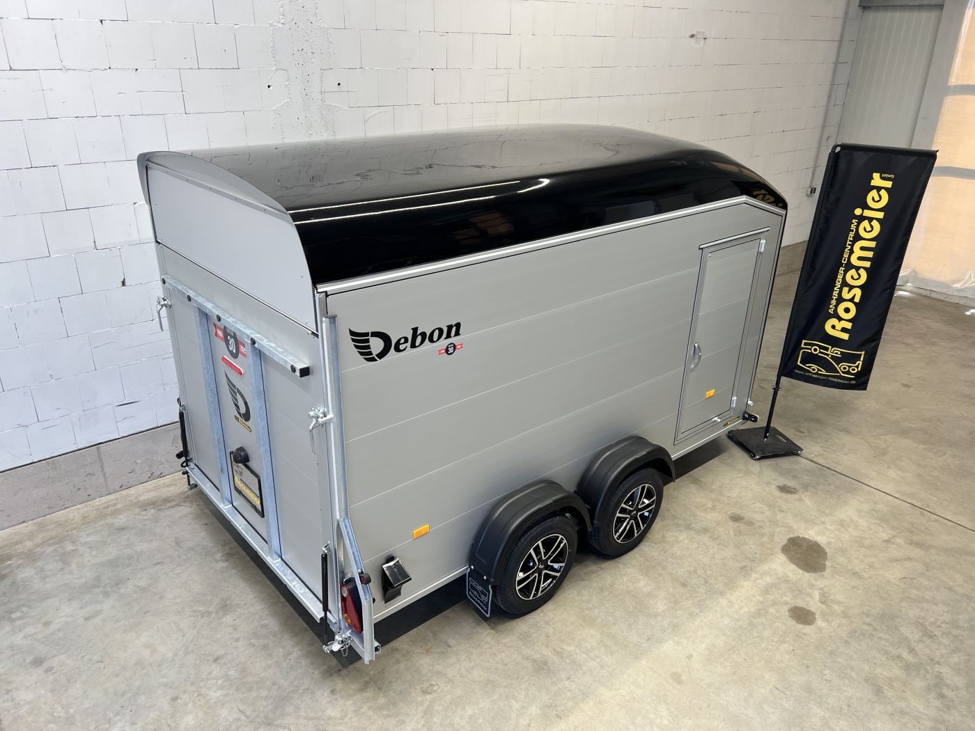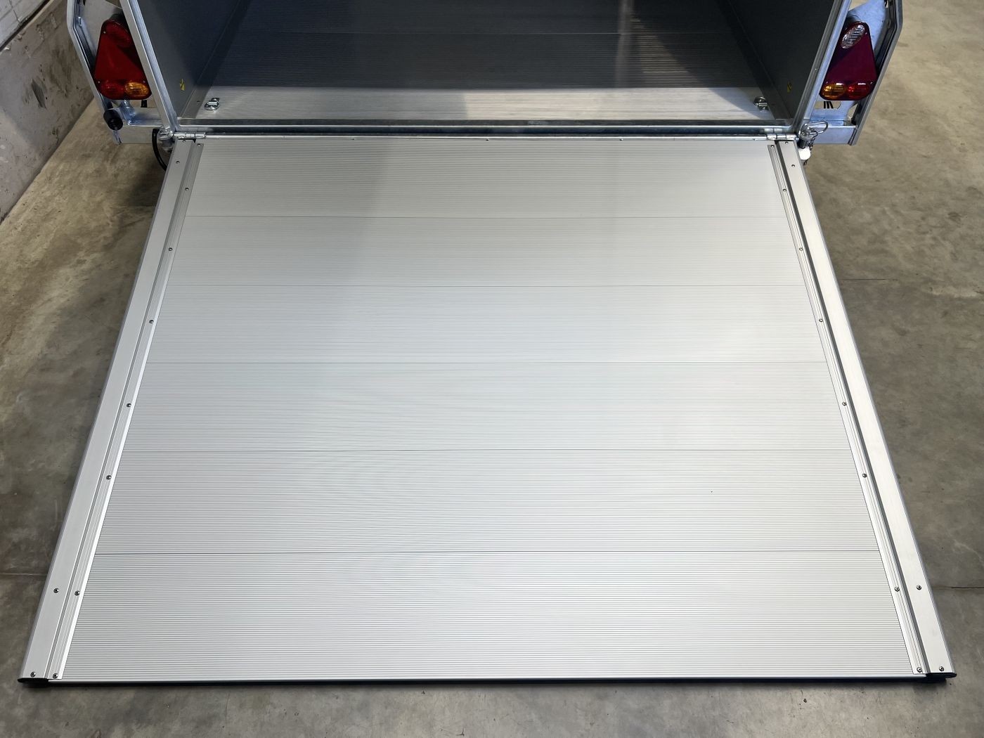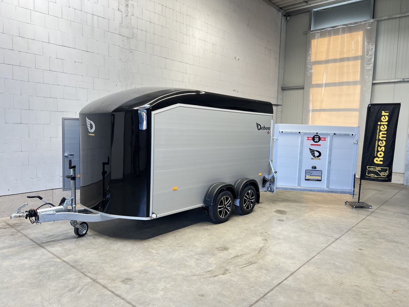 Alu-Kofferanhänger mit seitlicher Einstiegstür und Tür/Rampen-Kombination und Alu-Felgen