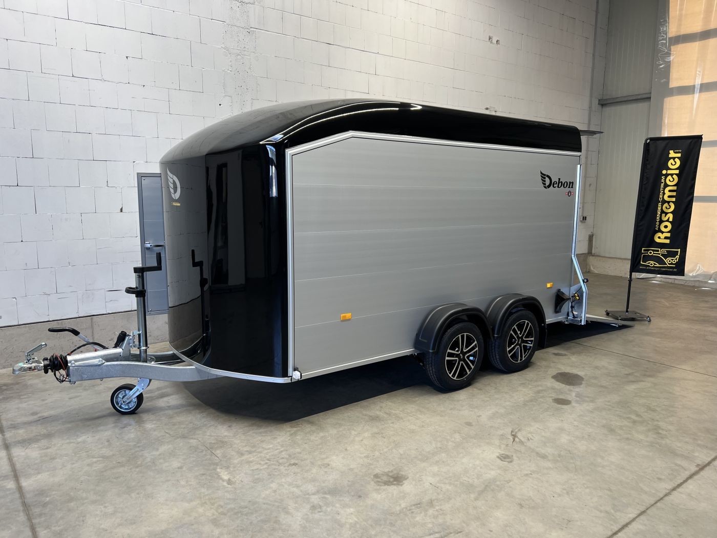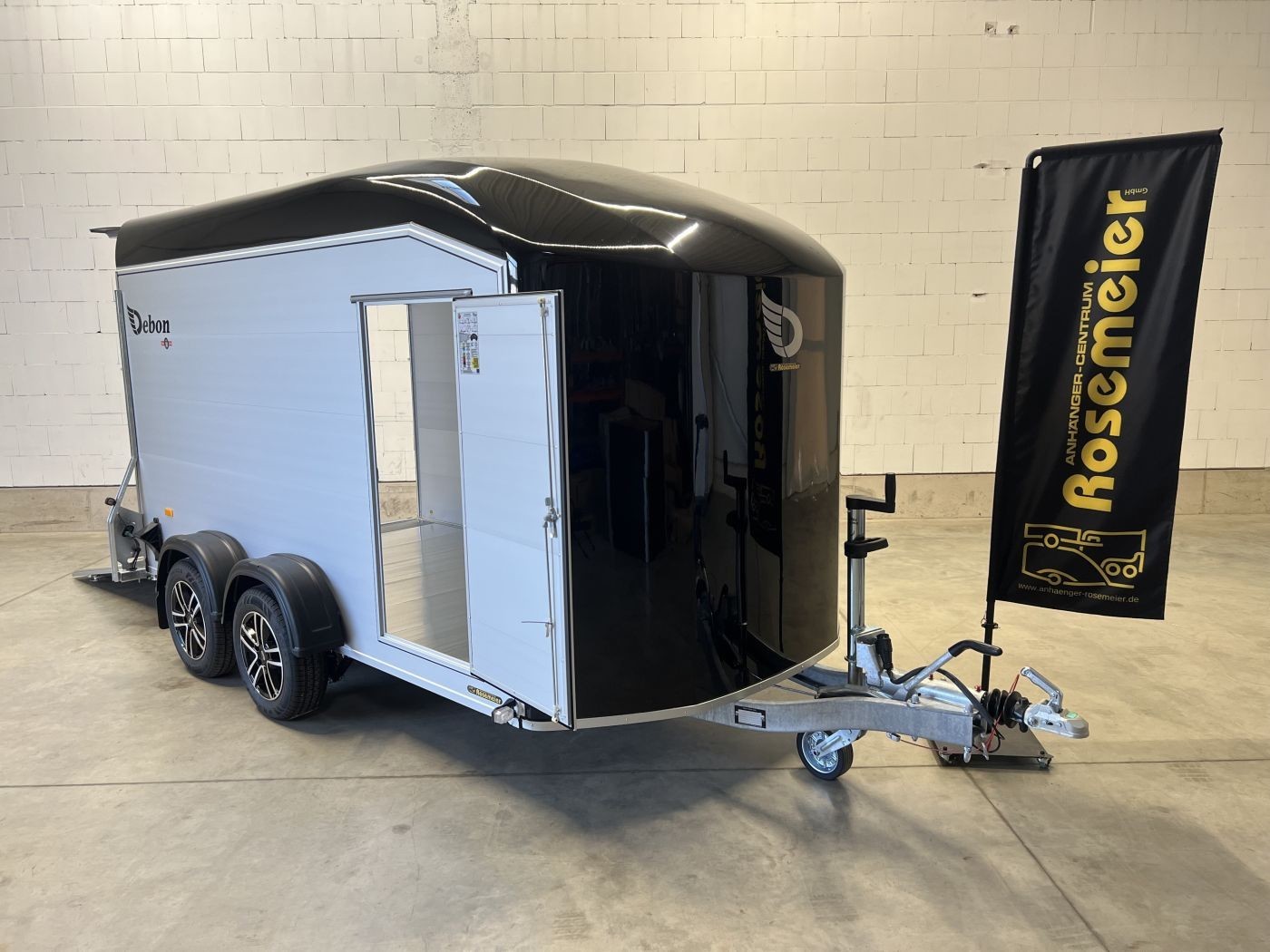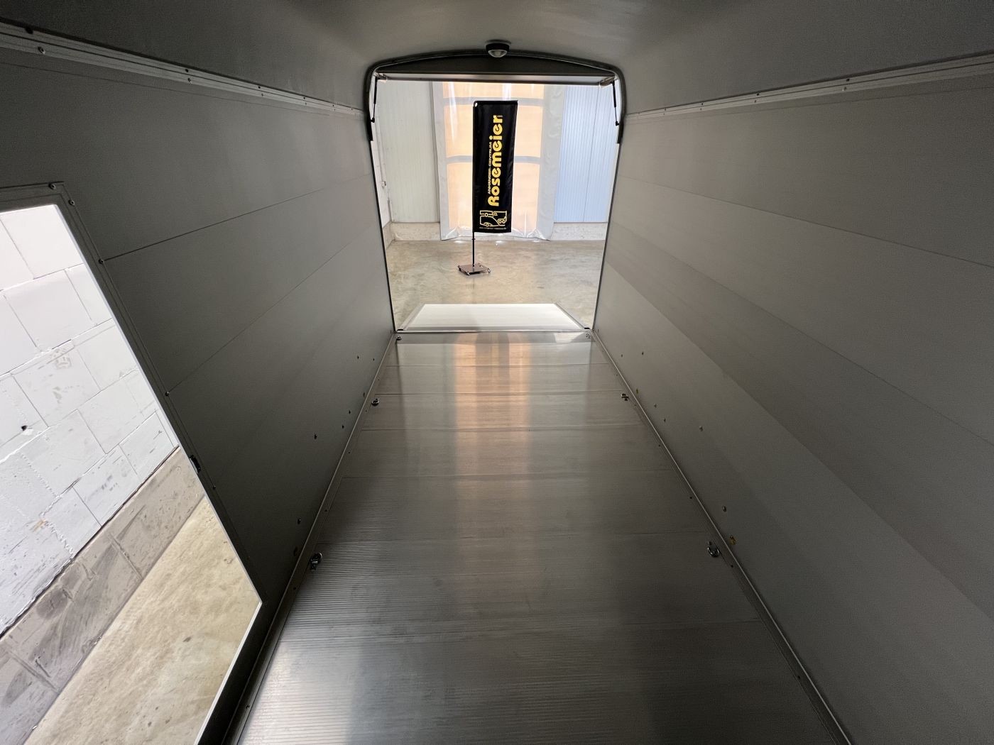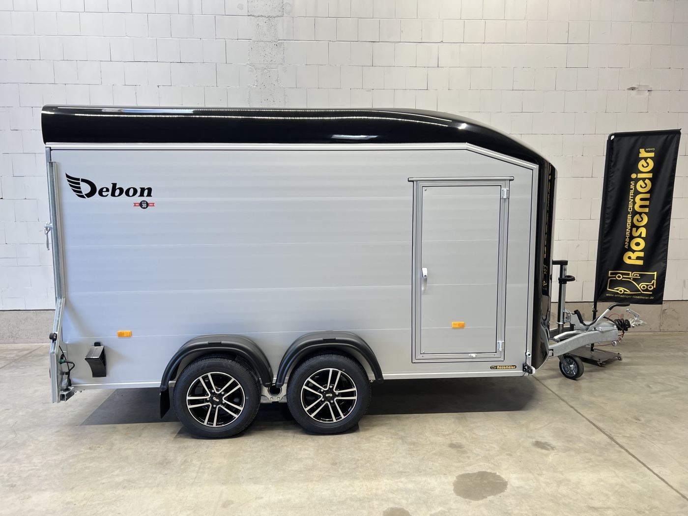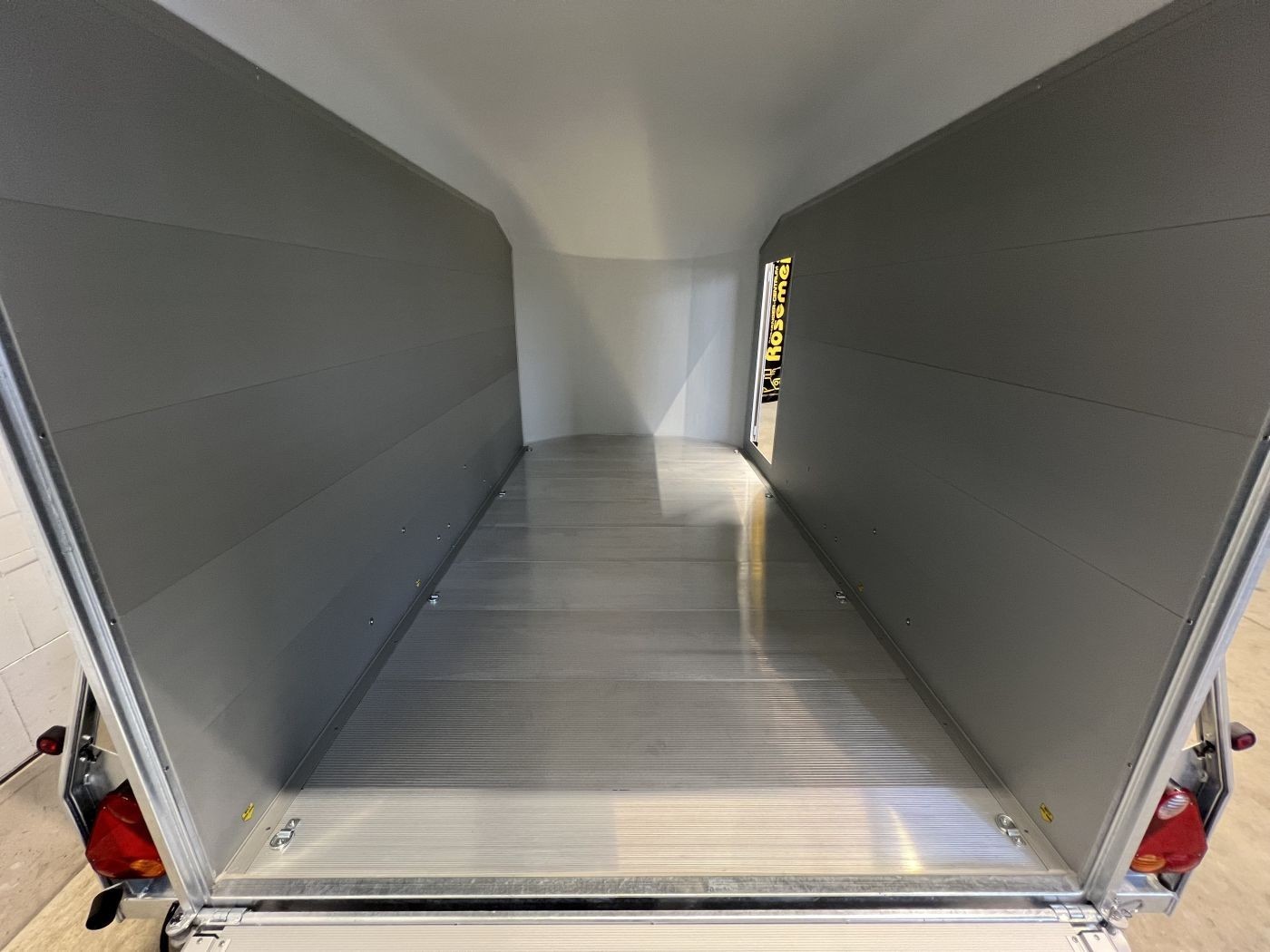 Alu-Kofferanhänger mit seitlicher Einstiegstür und Tür/Rampen-Kombination und Alu-Felgen
