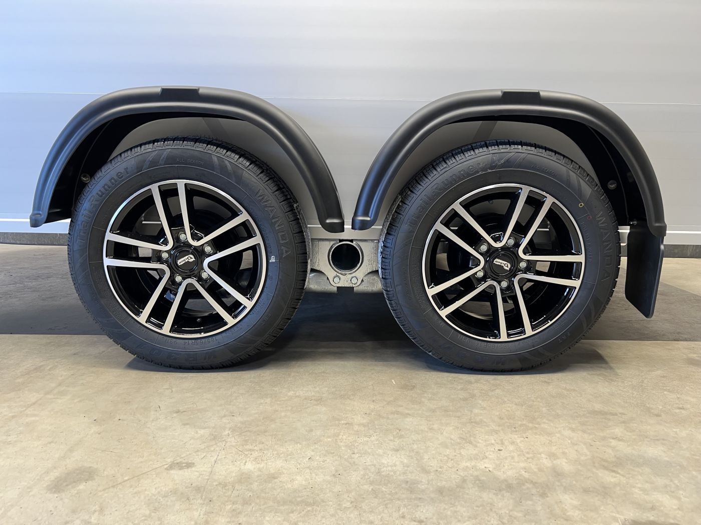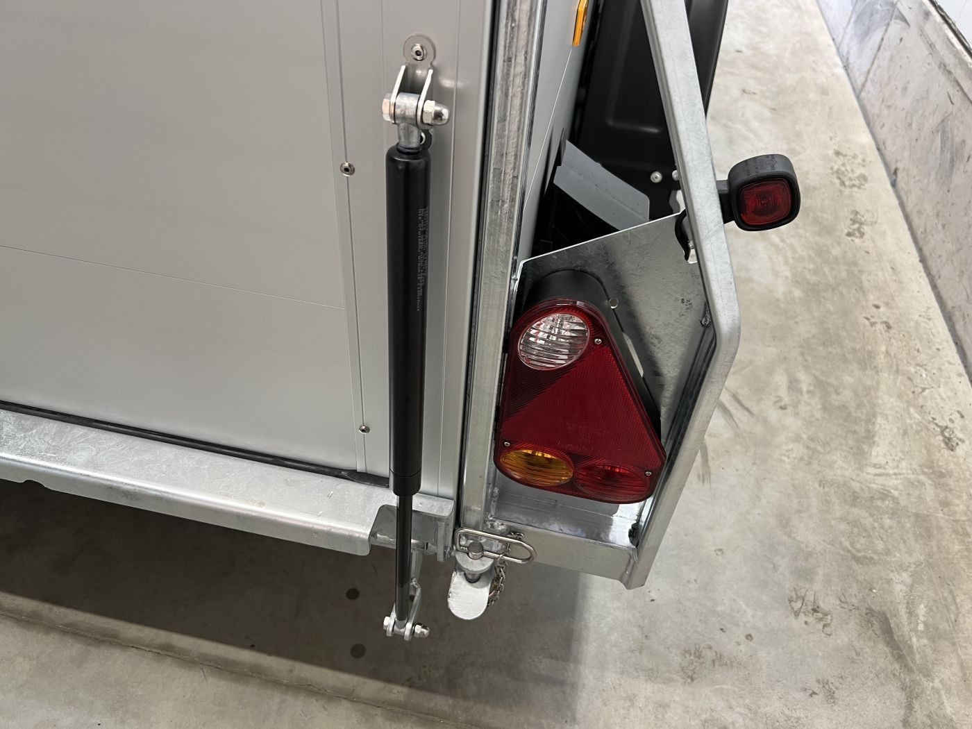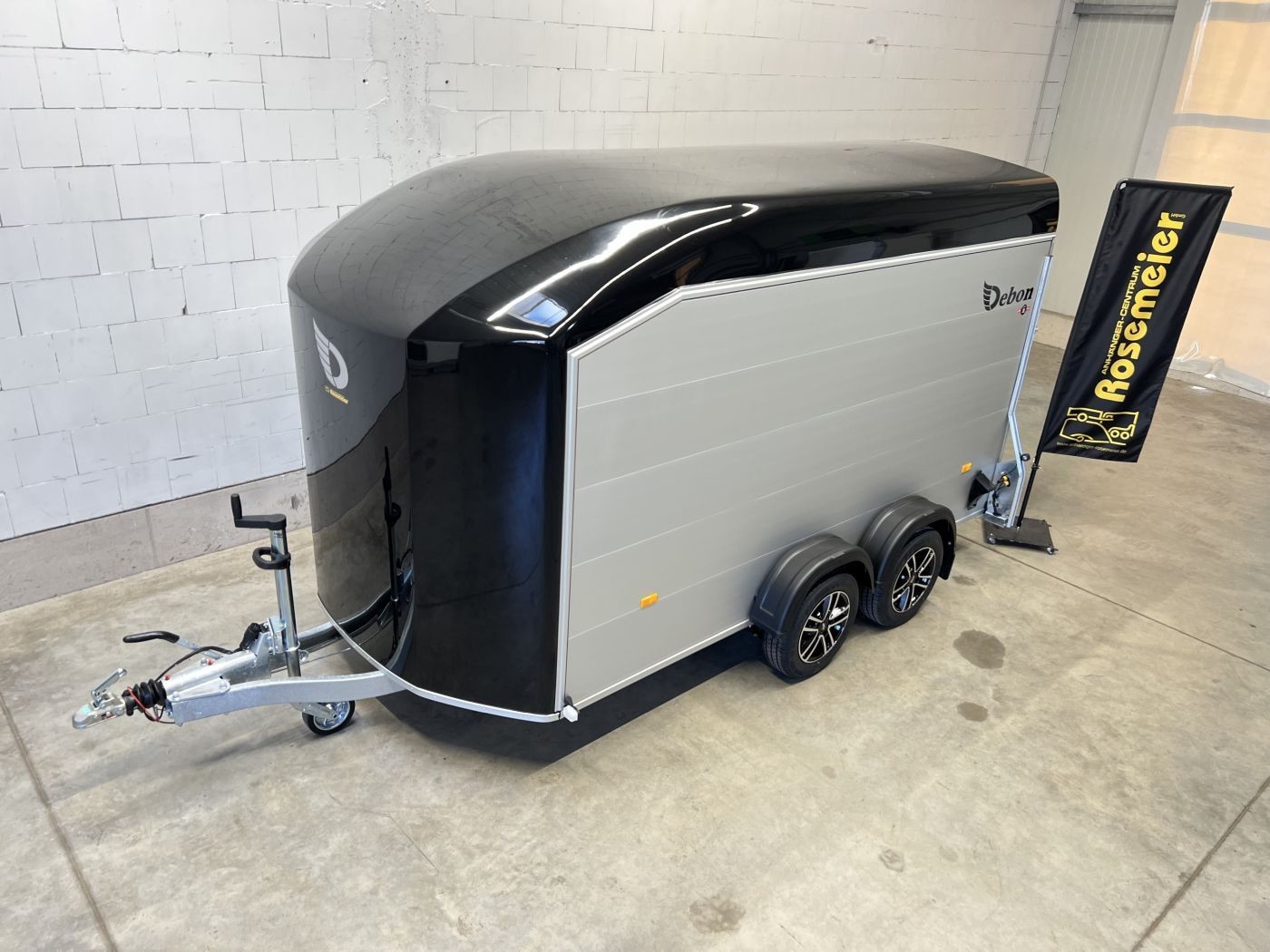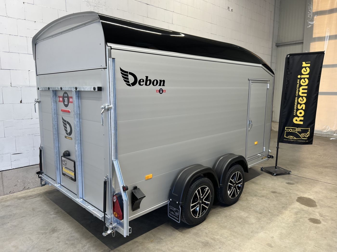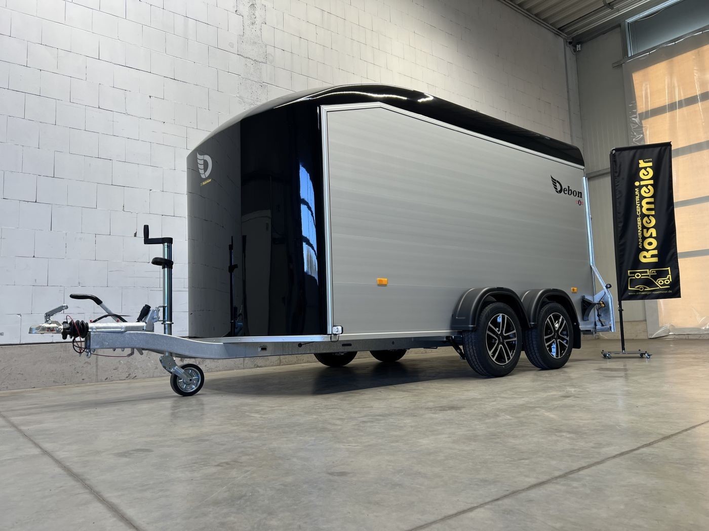 Alu-Kofferanhänger mit seitlicher Einstiegstür und Tür/Rampen-Kombination und Alu-Felgen