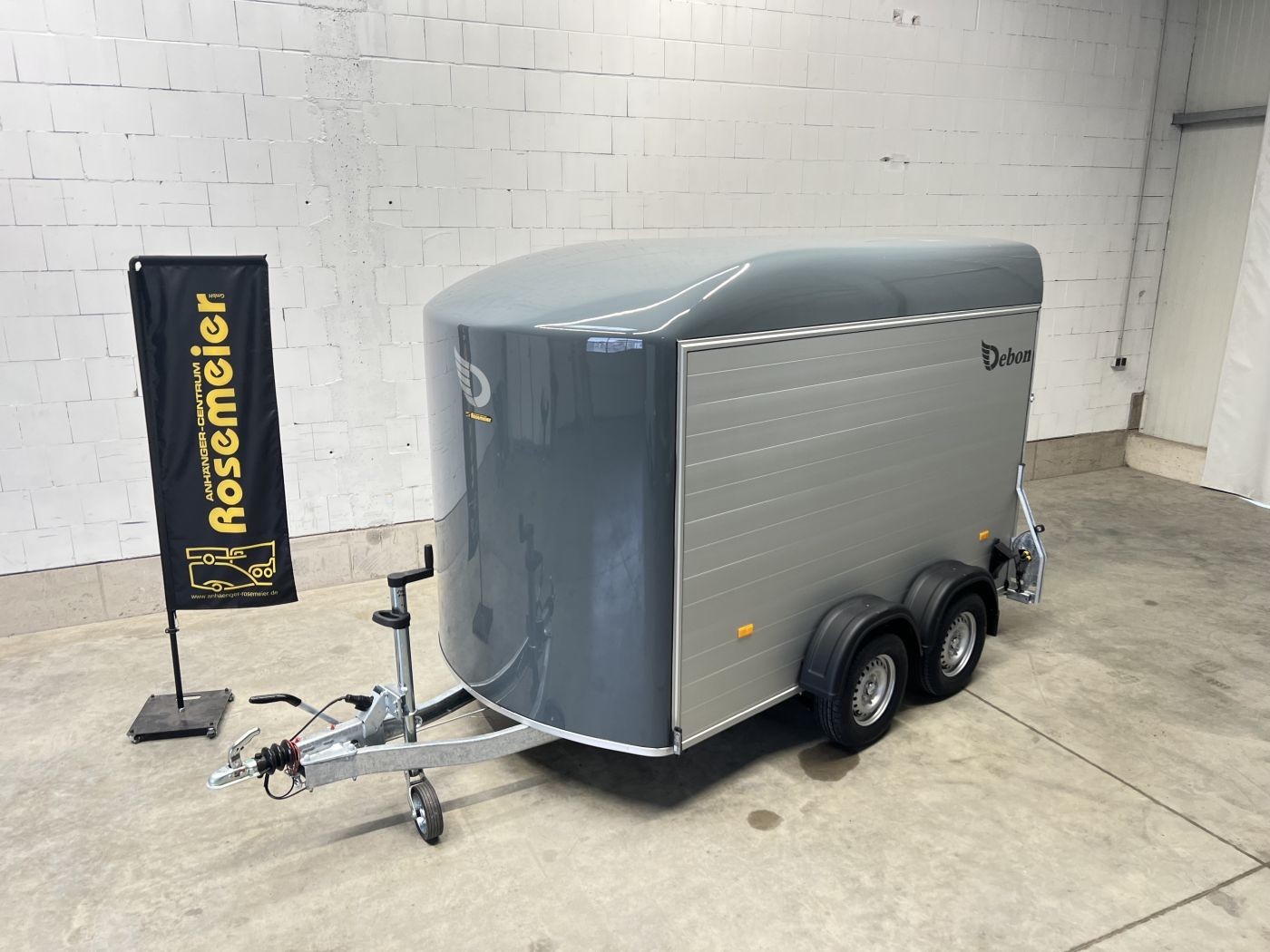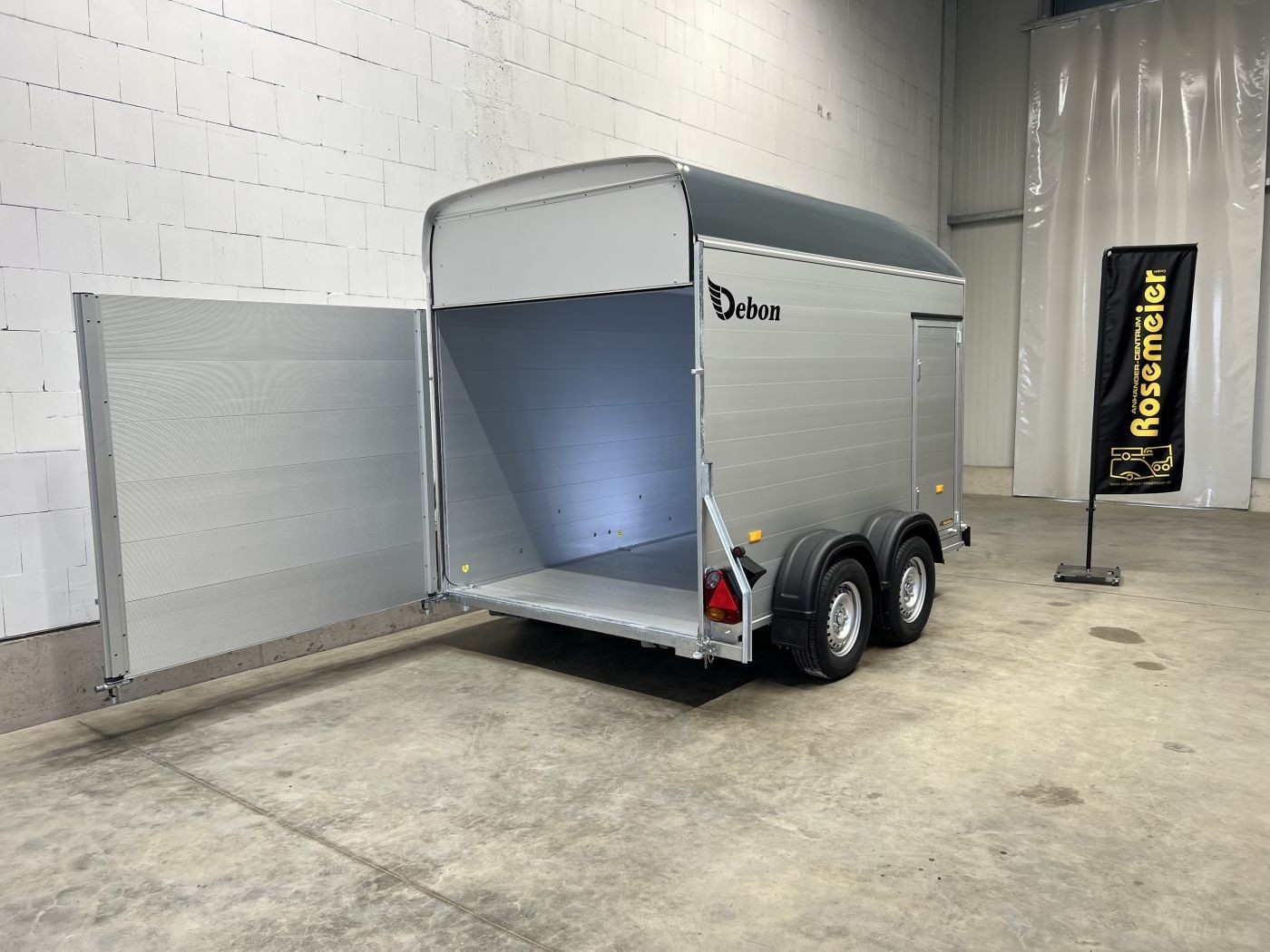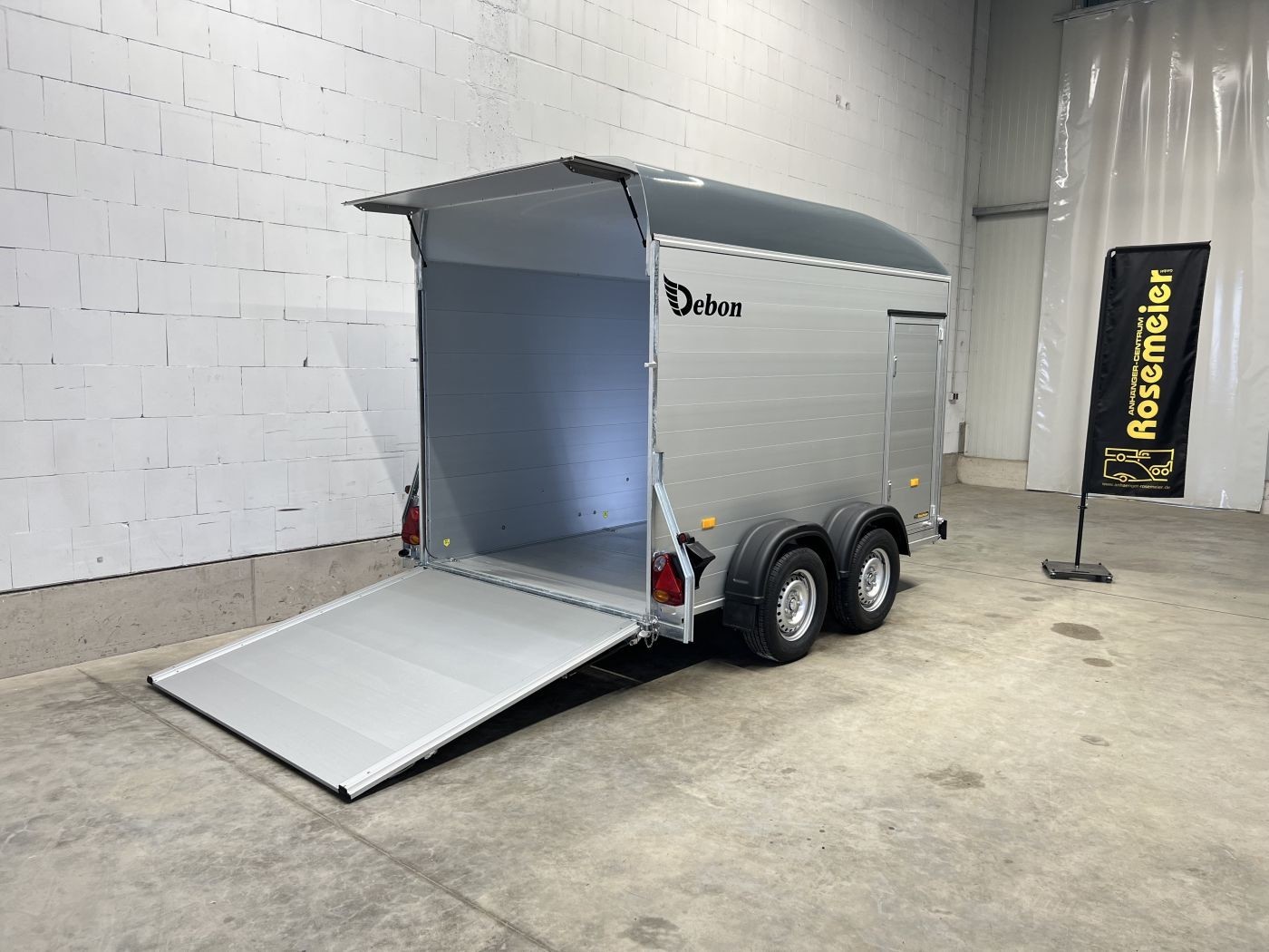 Alu-Kofferanhänger mit seitlicher Einstiegstür, Tür-Rampen-Kombination und aerodynamischem Vollpolyesteraufbau in iron-grau
