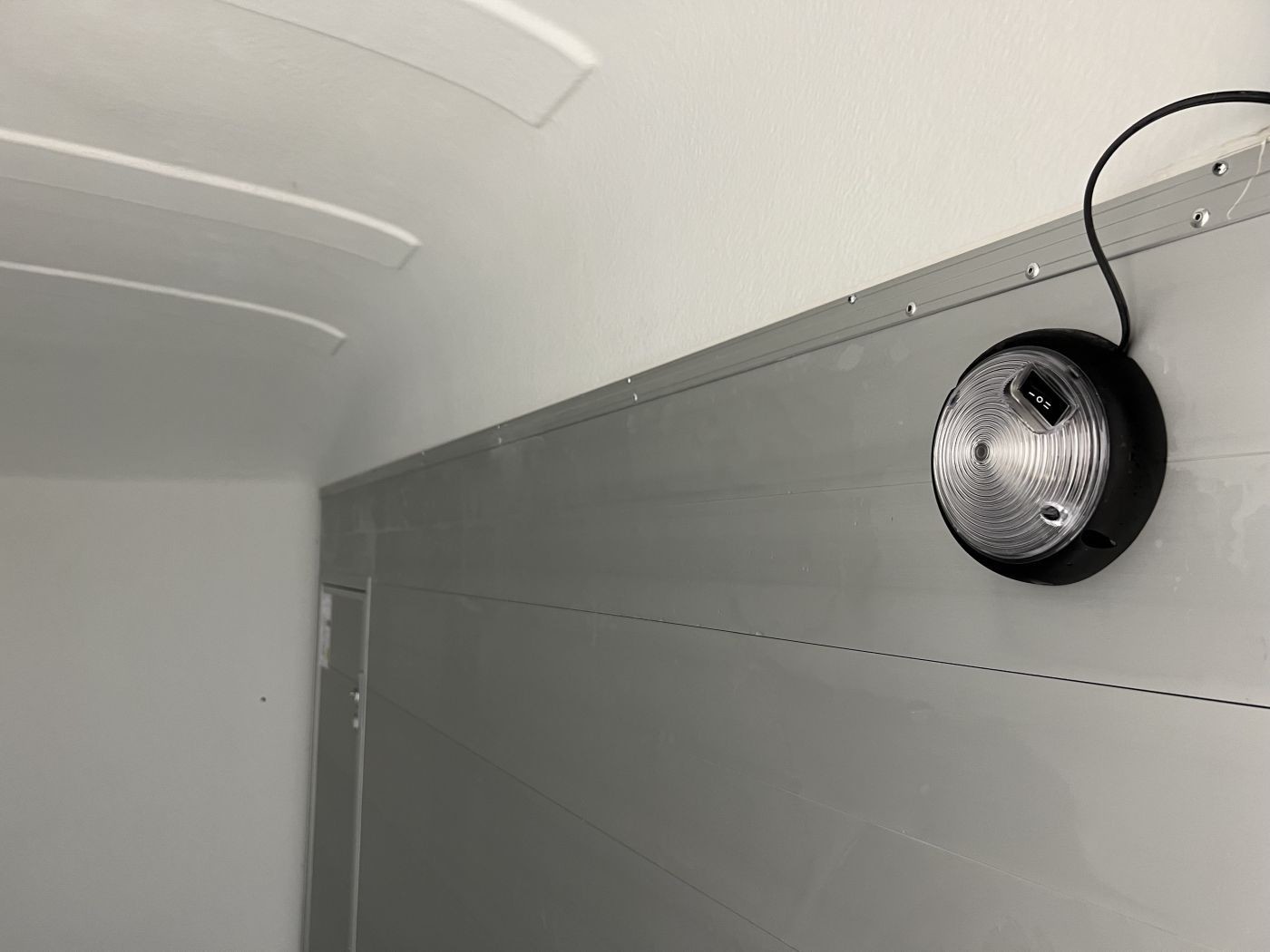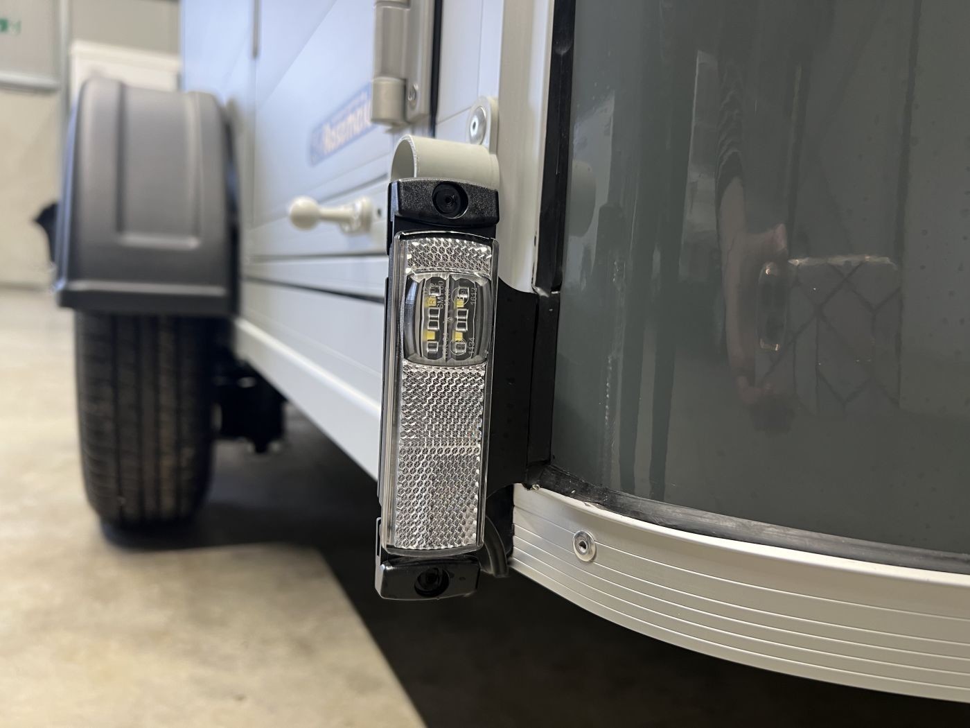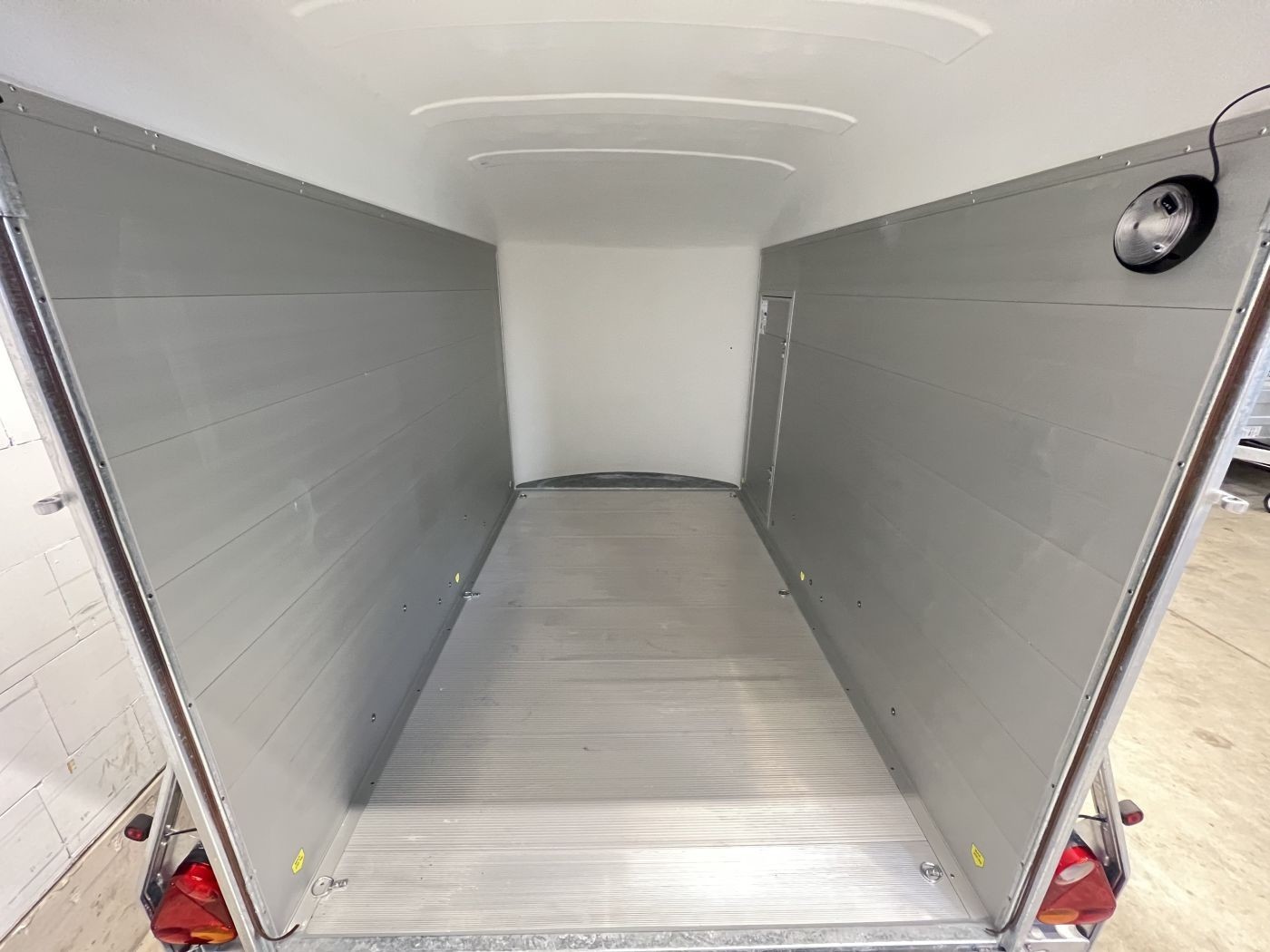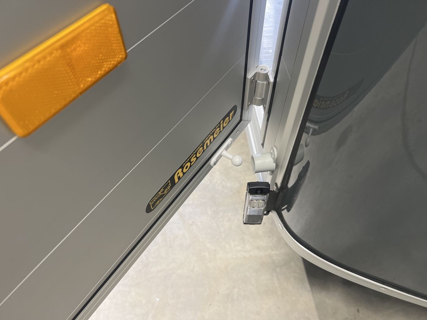 Alu-Kofferanhänger mit seitlicher Einstiegstür, Tür-Rampen-Kombination und aerodynamischem Vollpolyesteraufbau in iron-grau
