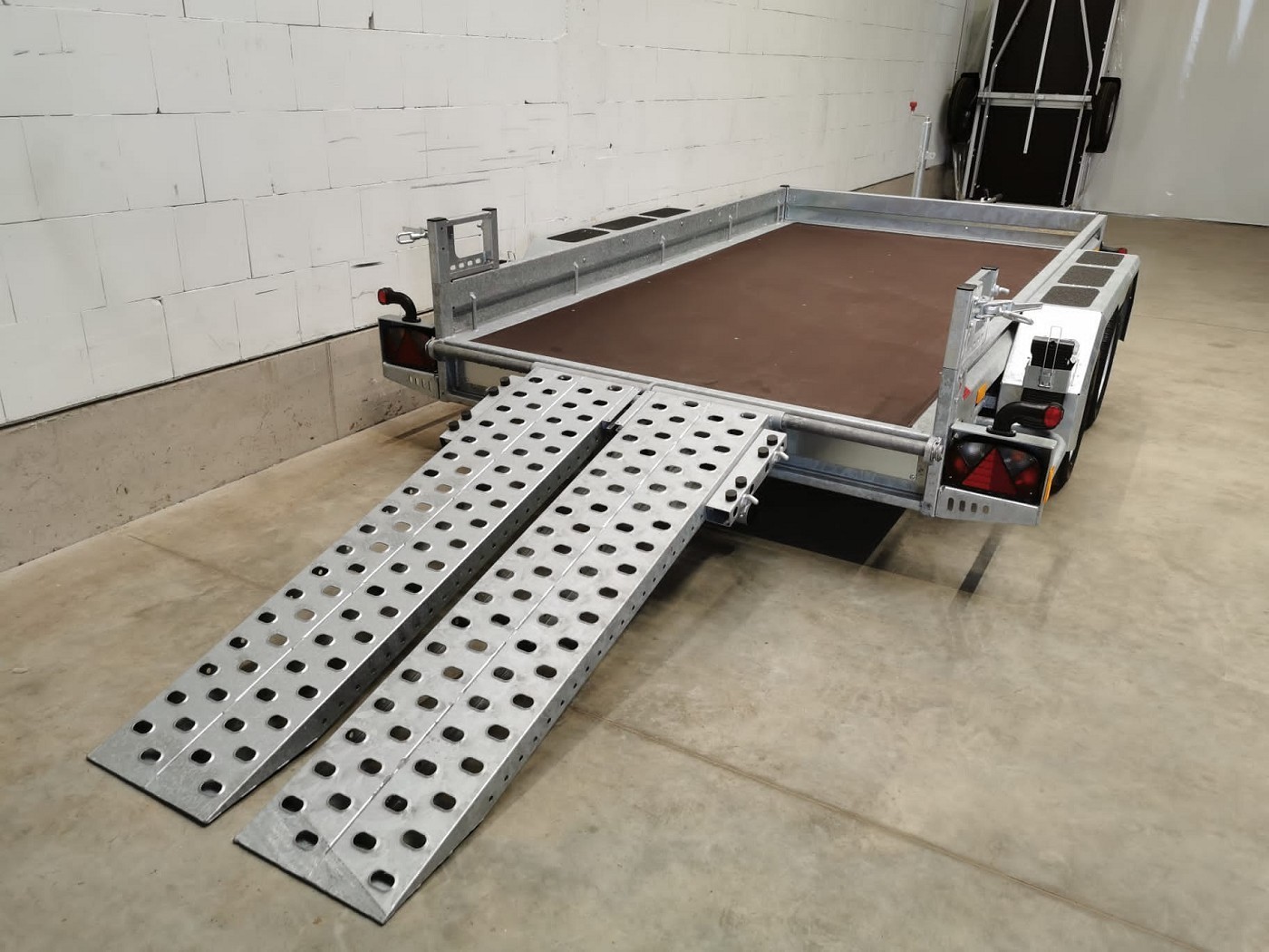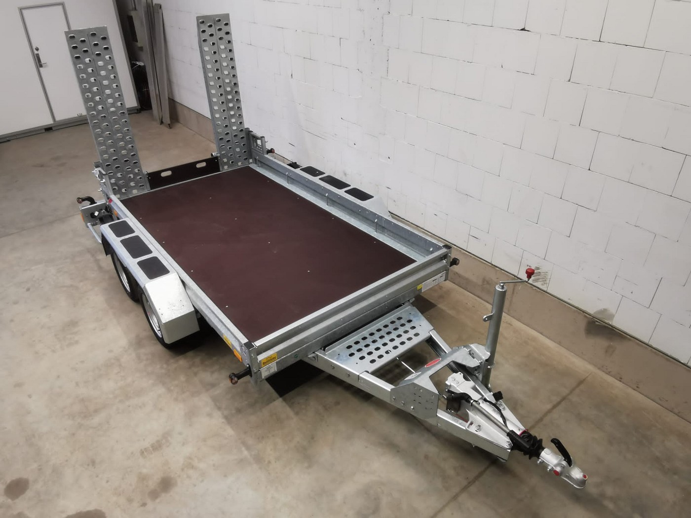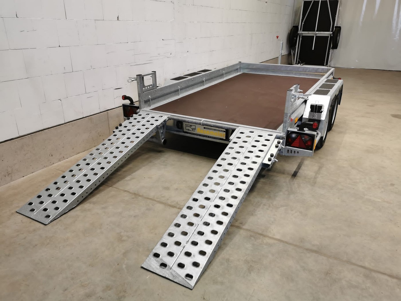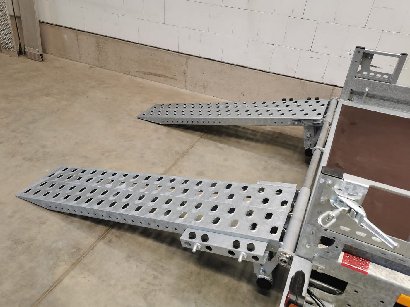 • Klappbare Stahl-Auffahrschienen, gelocht, verschiebbar, mit festem Stützbügel