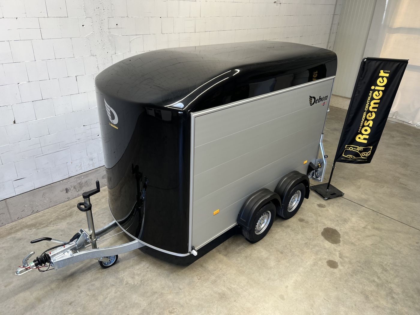 Alu-Kofferanhänger mit seitlicher Einstiegstür, Tür-Rampen-Kombination und aerodynamischem Vollpolyesteraufbau in schwarz