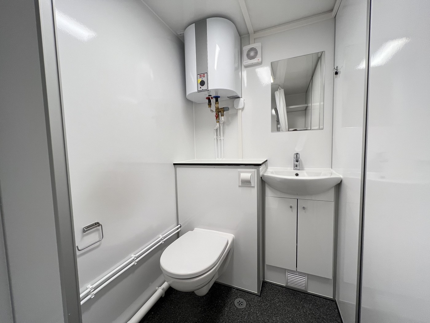 • WC mit wasserspülender, wandaufgehängter Toilette