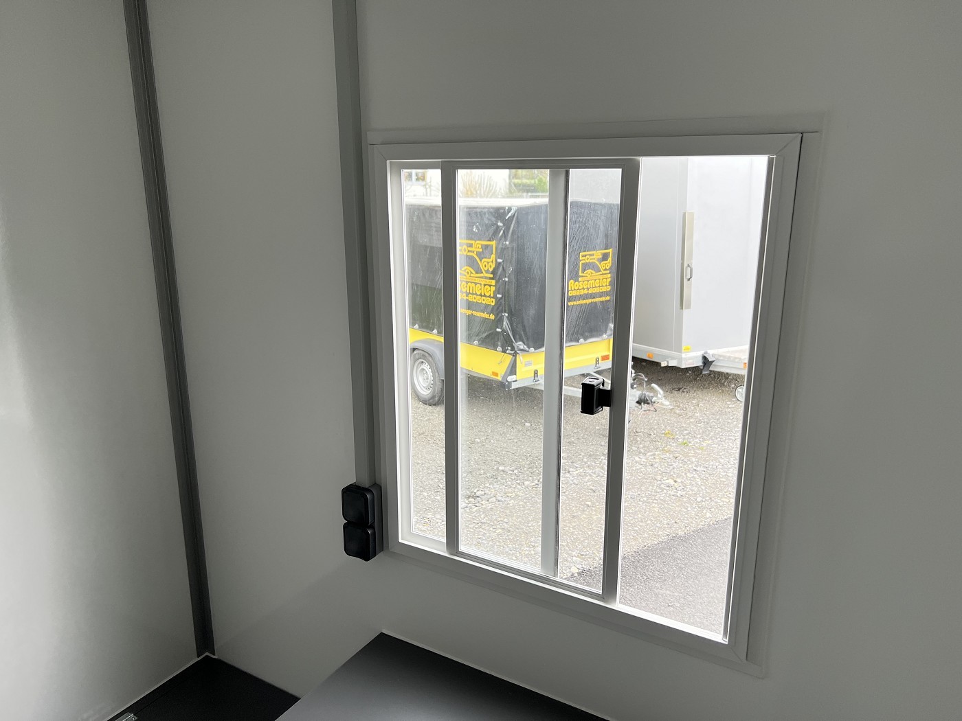 • 1 Schiebefenster 750 x 850 mm mit Blechladen