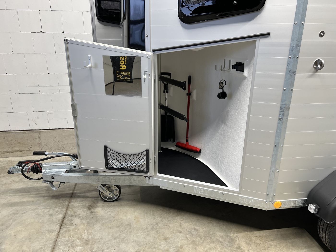 Abschließbare Sattelkammer: Ausgestattet mit ausziehbaren Sattelhaltern, Besen, Schaufel, Staunetz, Trensen- und Gertenhaltern