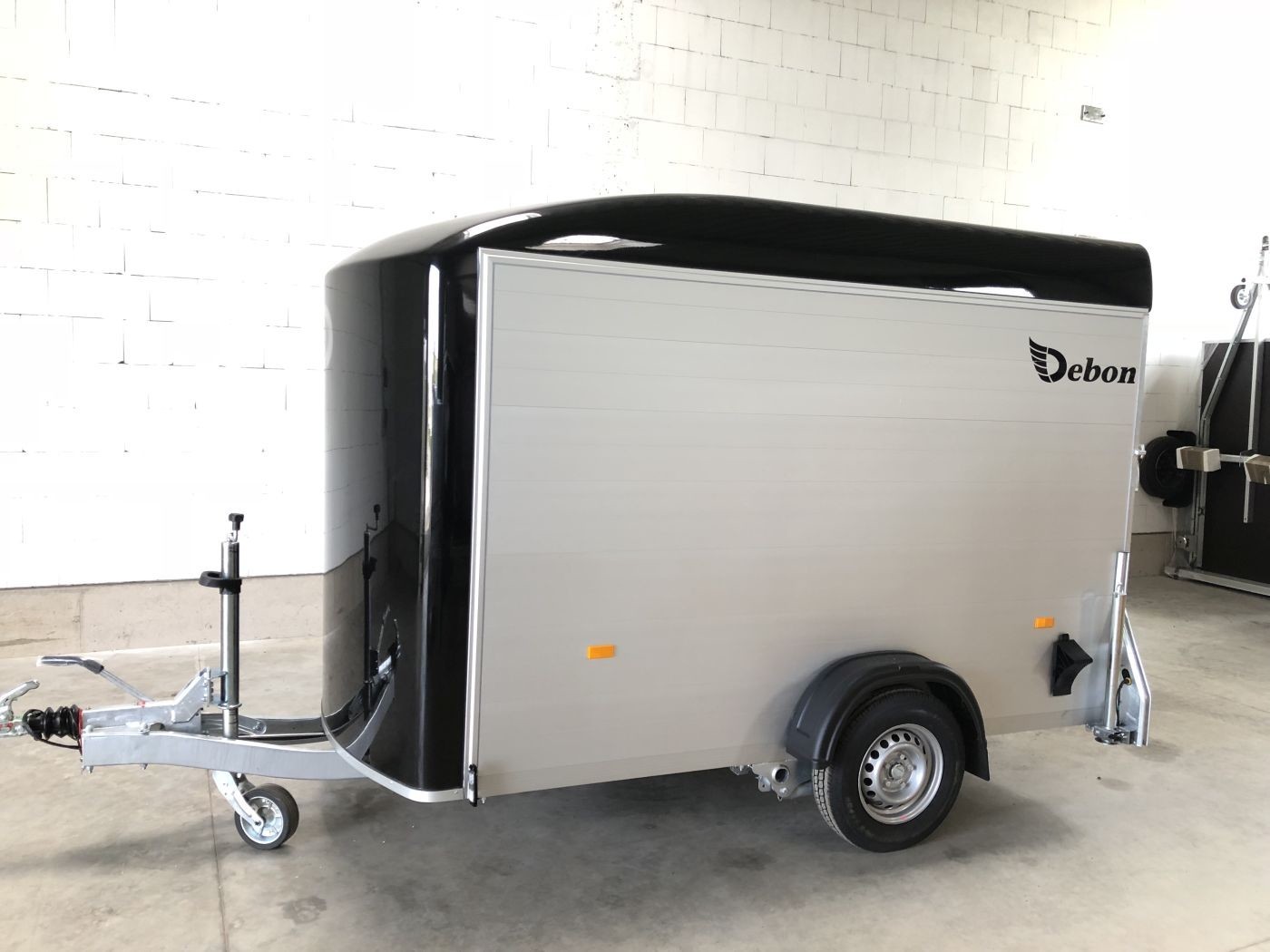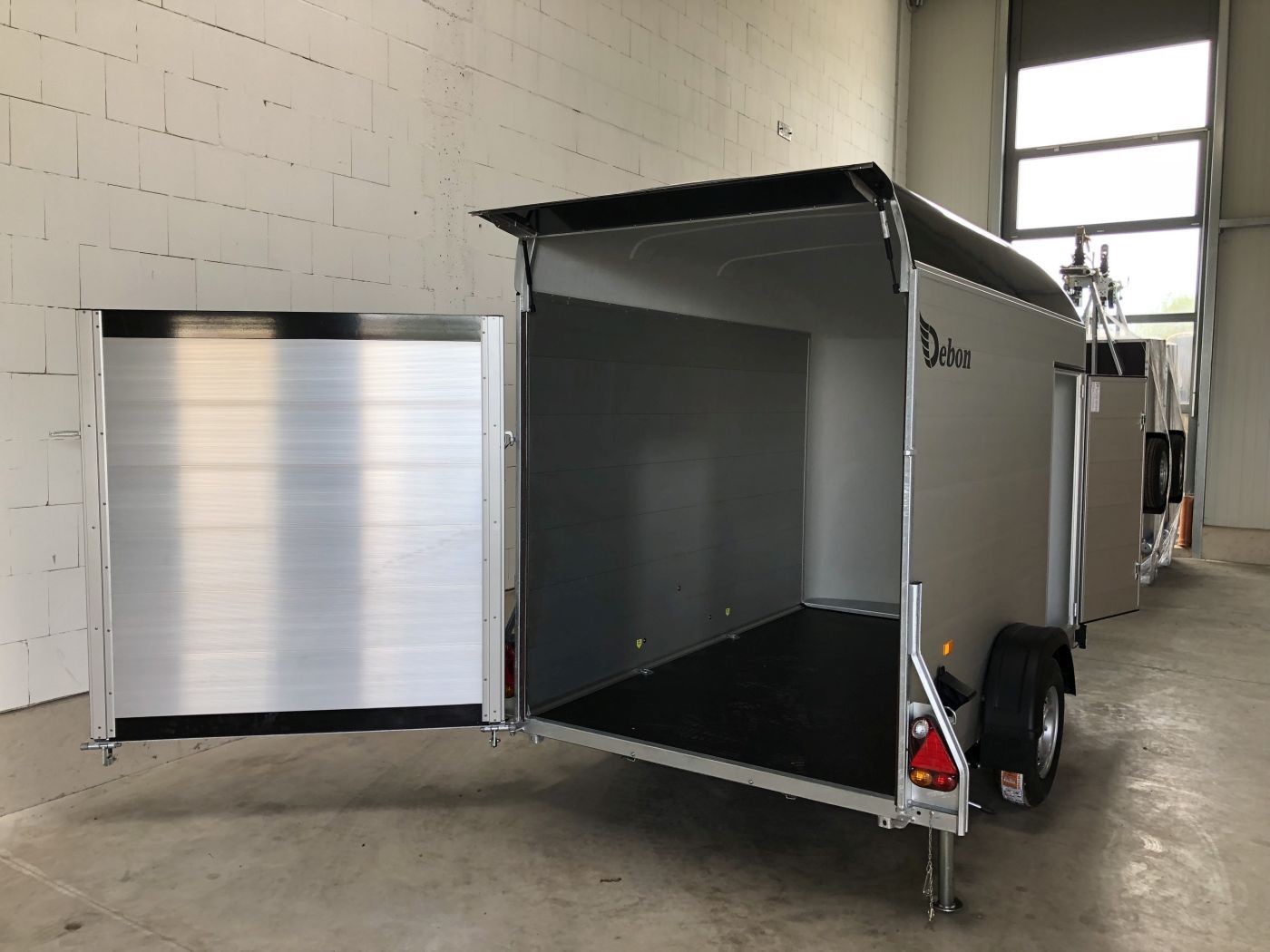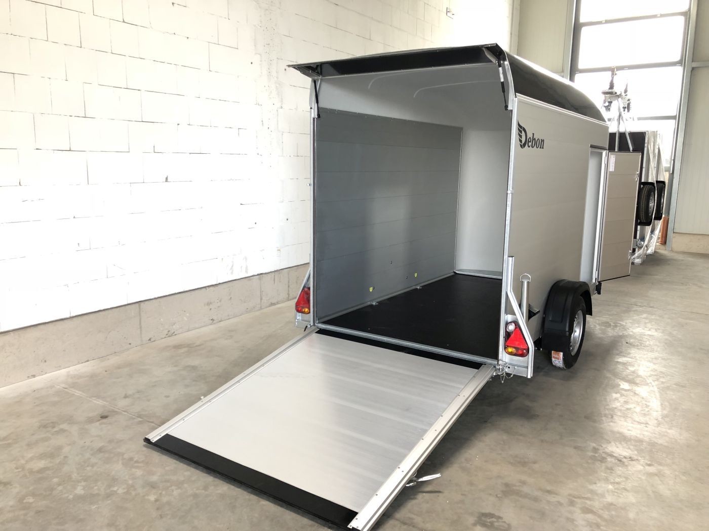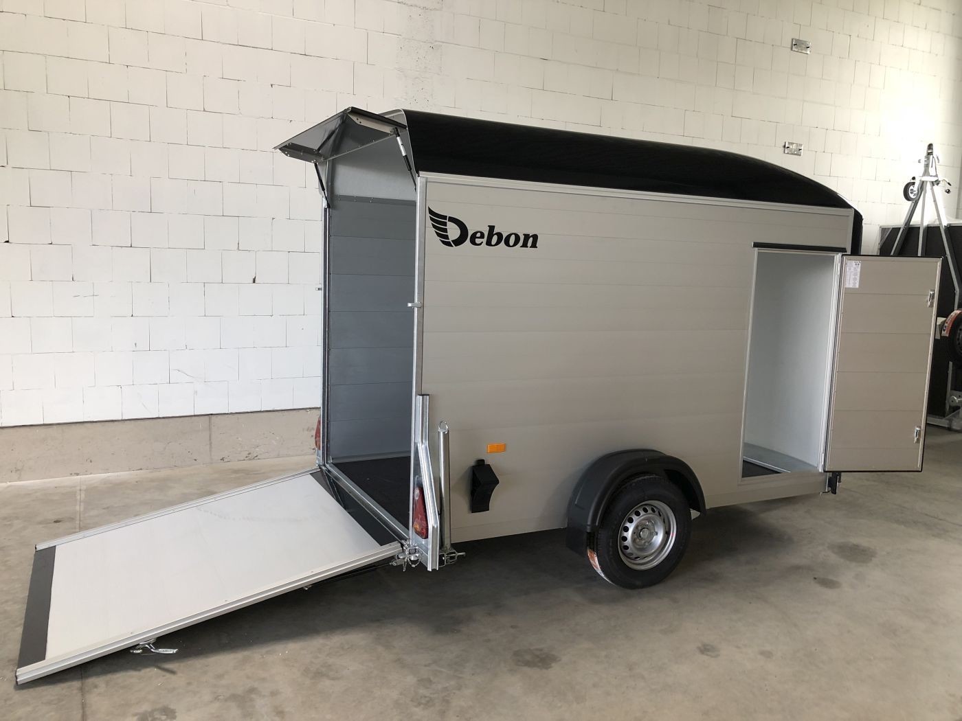 Alu-Kofferanhänger mit seitlicher Einstiegstür, Tür-Rampen-Kombination und aerodynamischem Vollpolyesteraufbau in schwarz