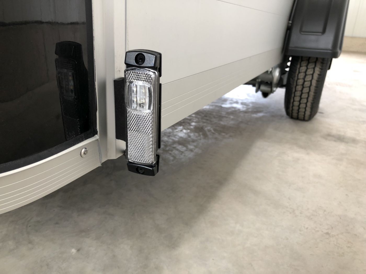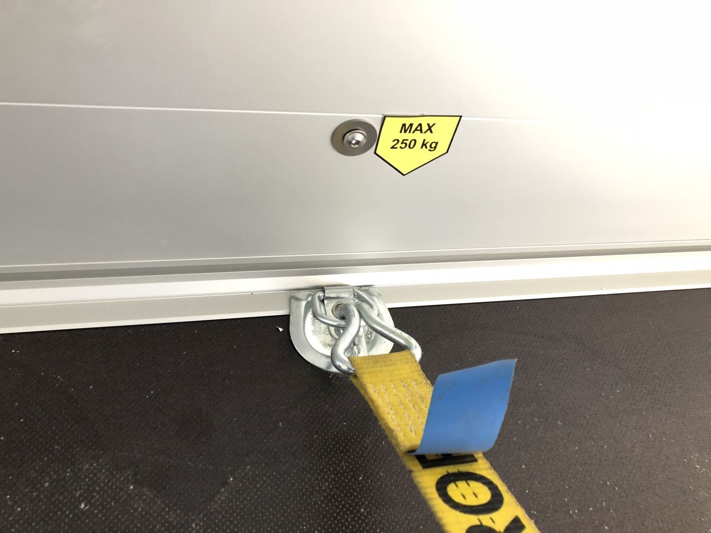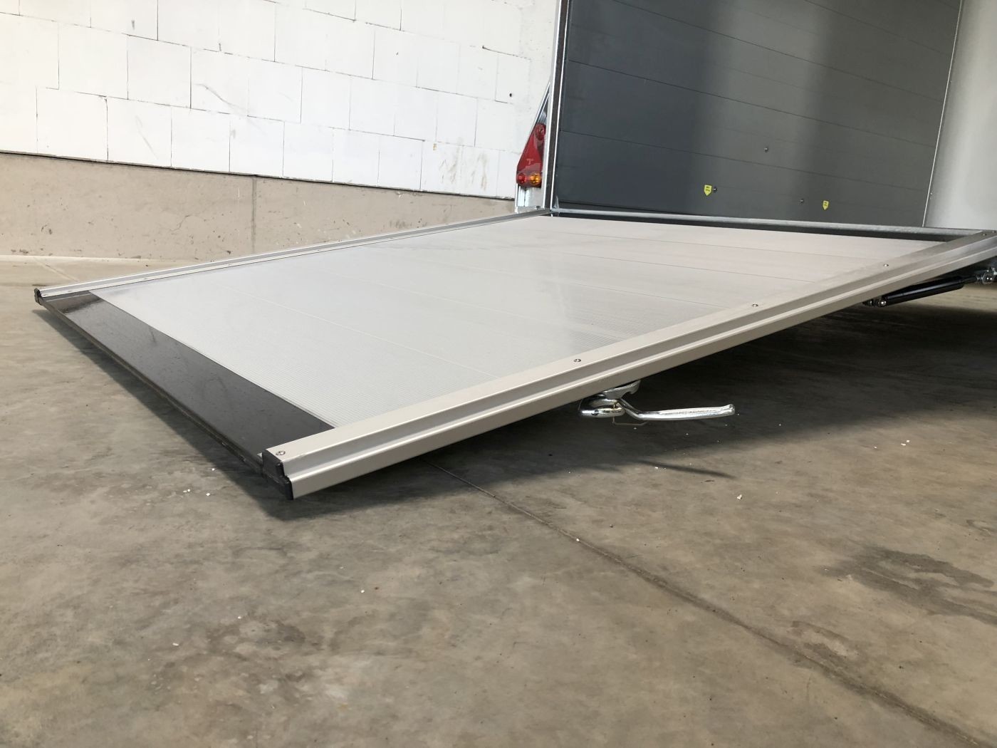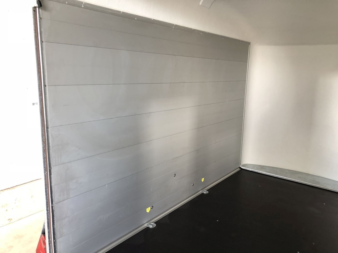 Alu-Kofferanhänger mit seitlicher Einstiegstür, Tür-Rampen-Kombination und aerodynamischem Vollpolyesteraufbau in schwarz