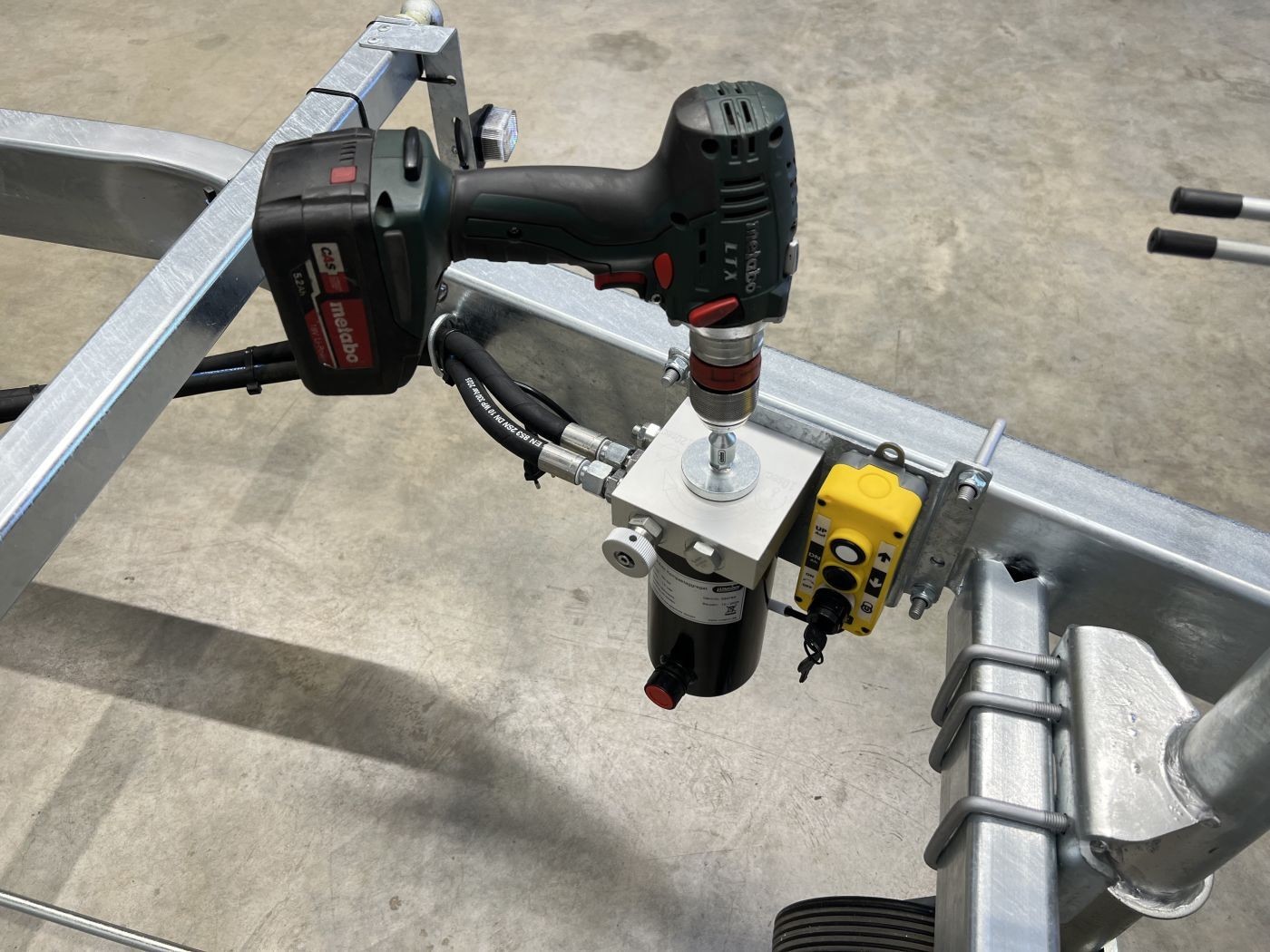Elektrohydraulische Pumpe mit Notpumpe Pumpless, für ein einfaches Kippen mit dem Akkuschrauber bei schwacher Batterie