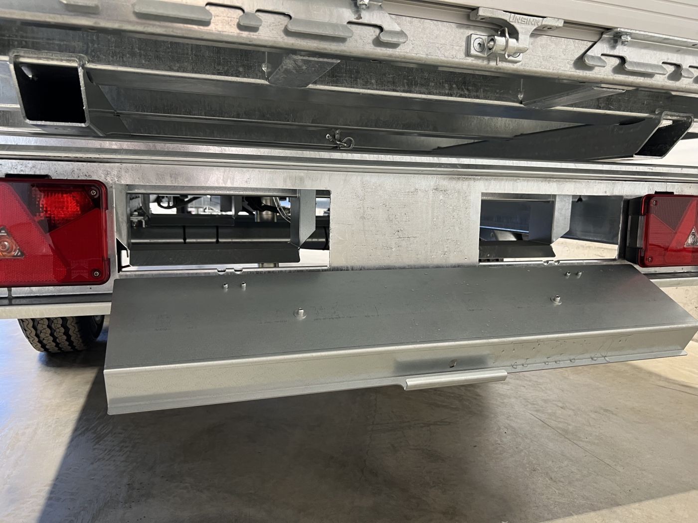 Integrierter Rampenschacht mit Spanneinrichtung und klappbarem Kennzeichenhalter für das Verstauen von Auffahrrschienen unter der Ladefläche