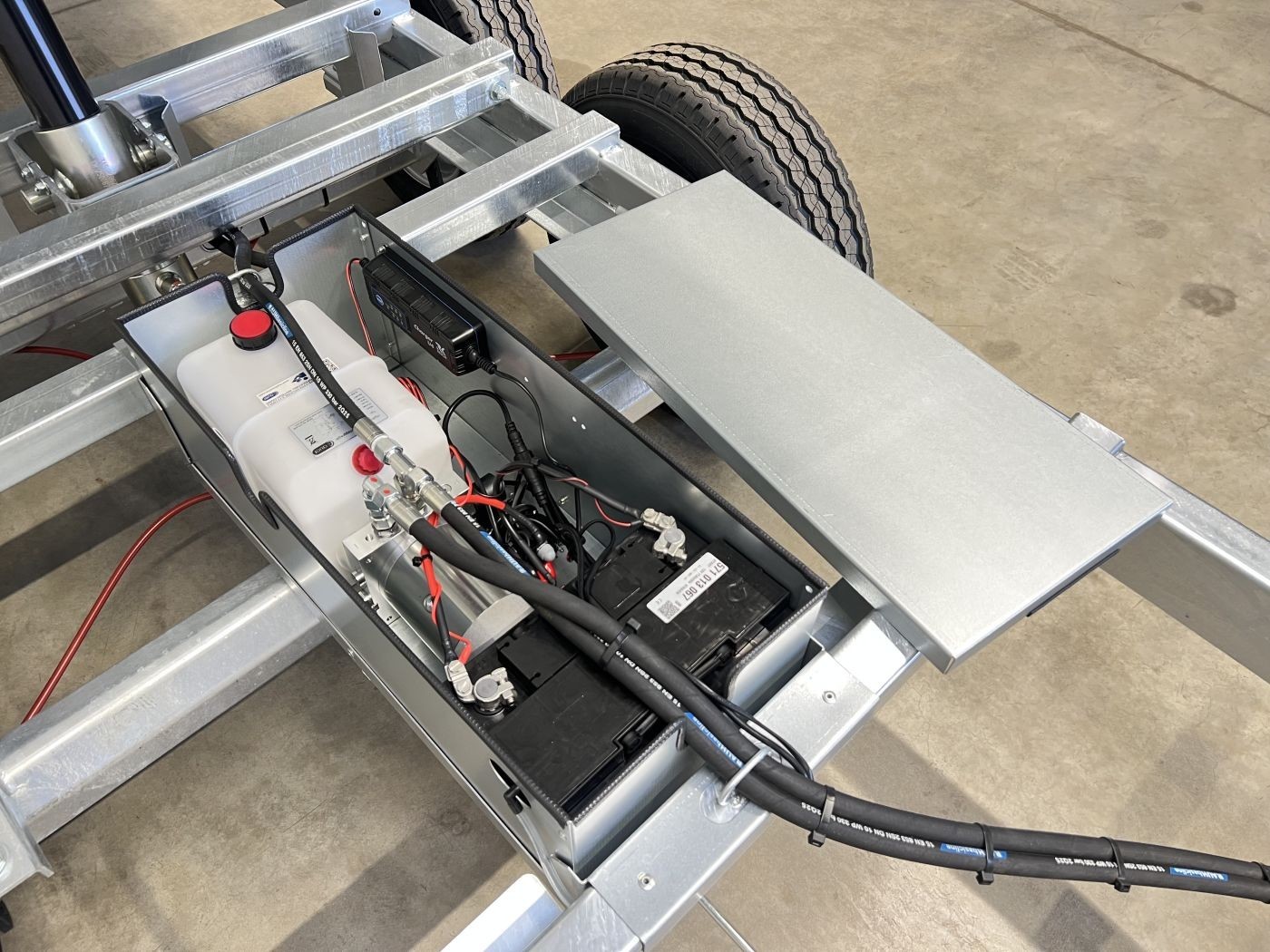 Batterie und Pumpeinheit sicher und gegen Schmutz geschützt im Batteriekasten verstaut