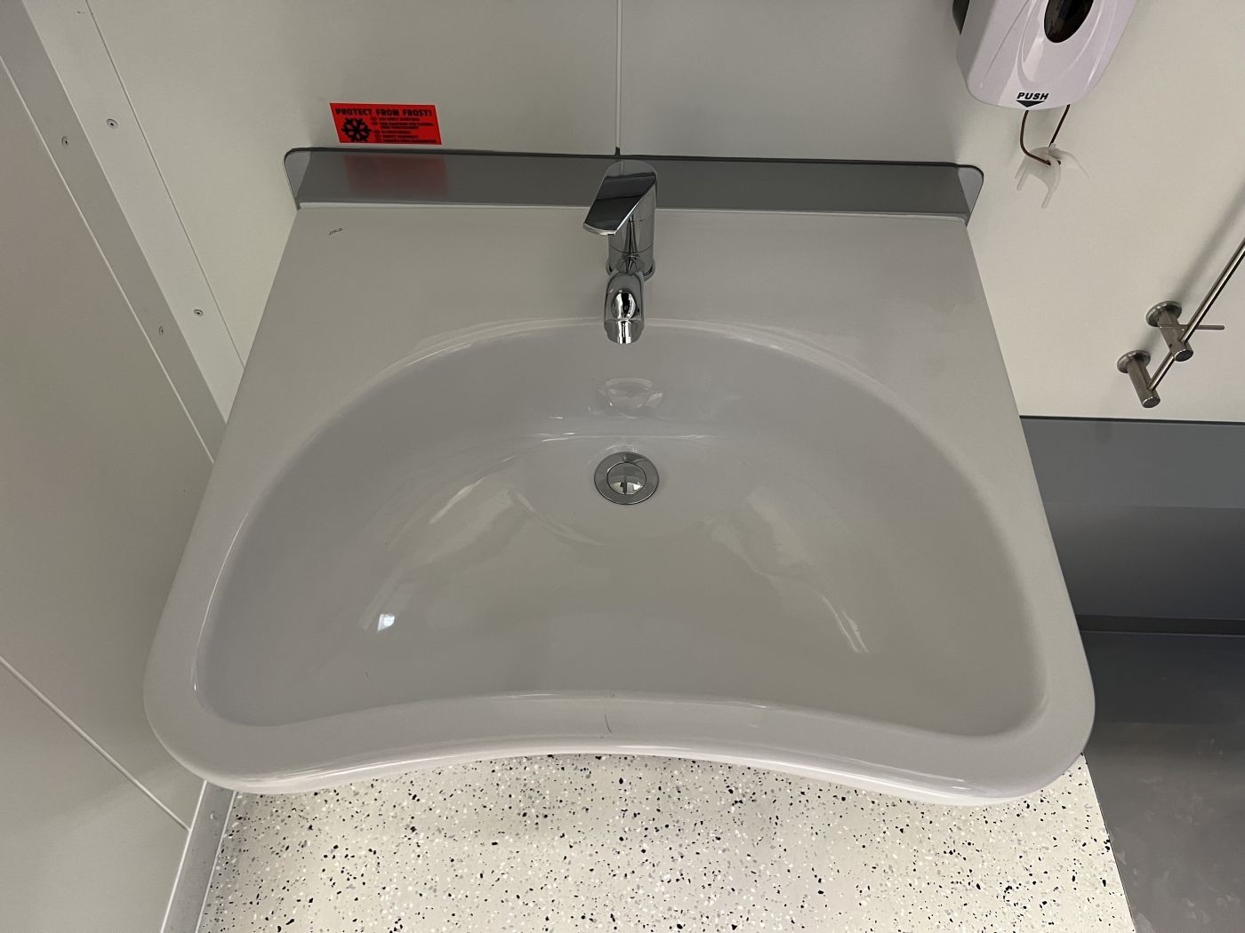 • Waschbecken ohne Unterschrank zum nahen Heranfahren mit dem Rollstuhl