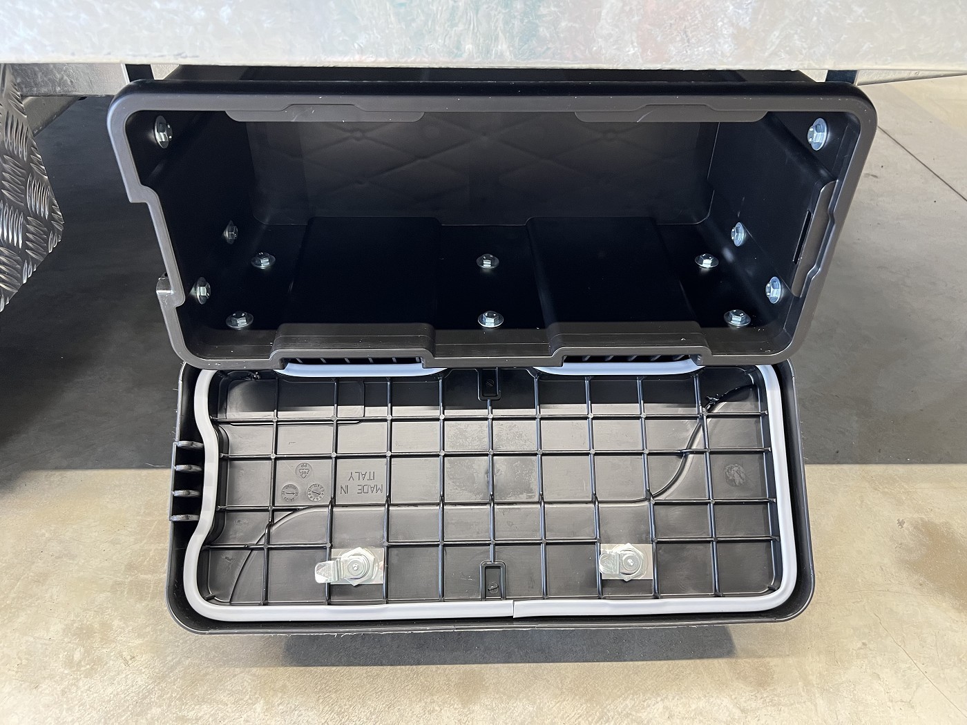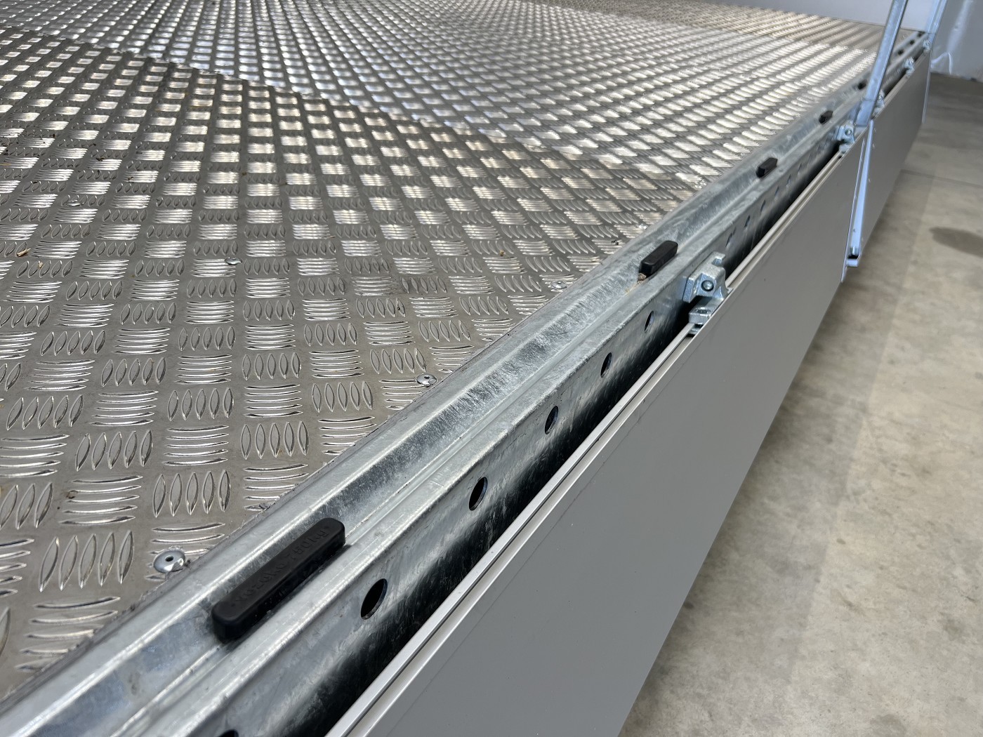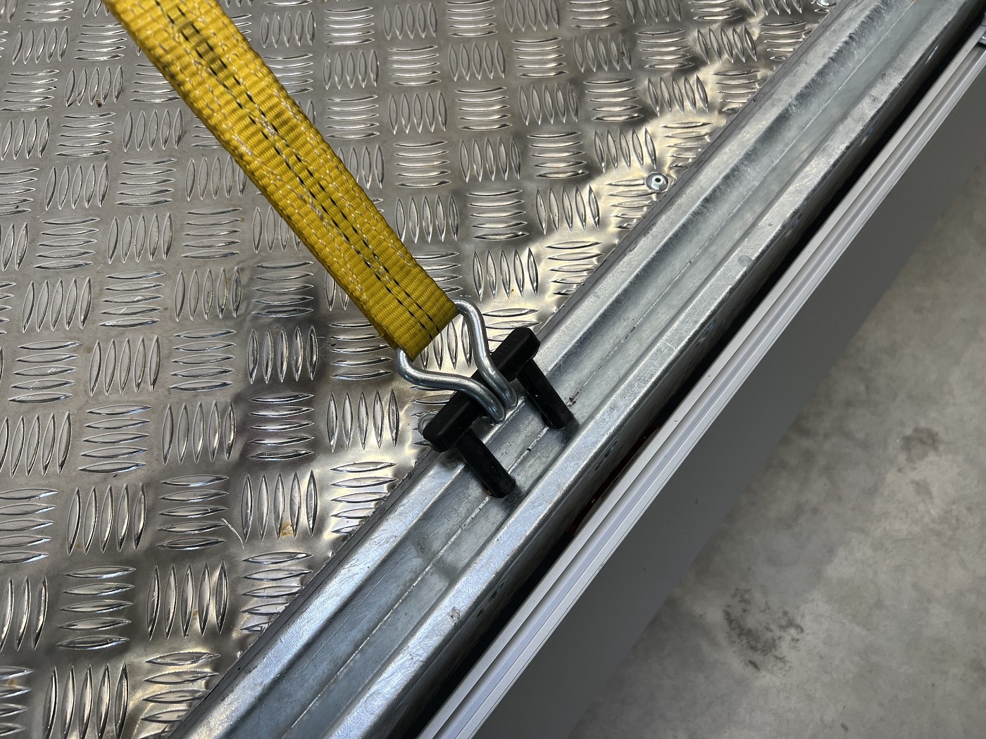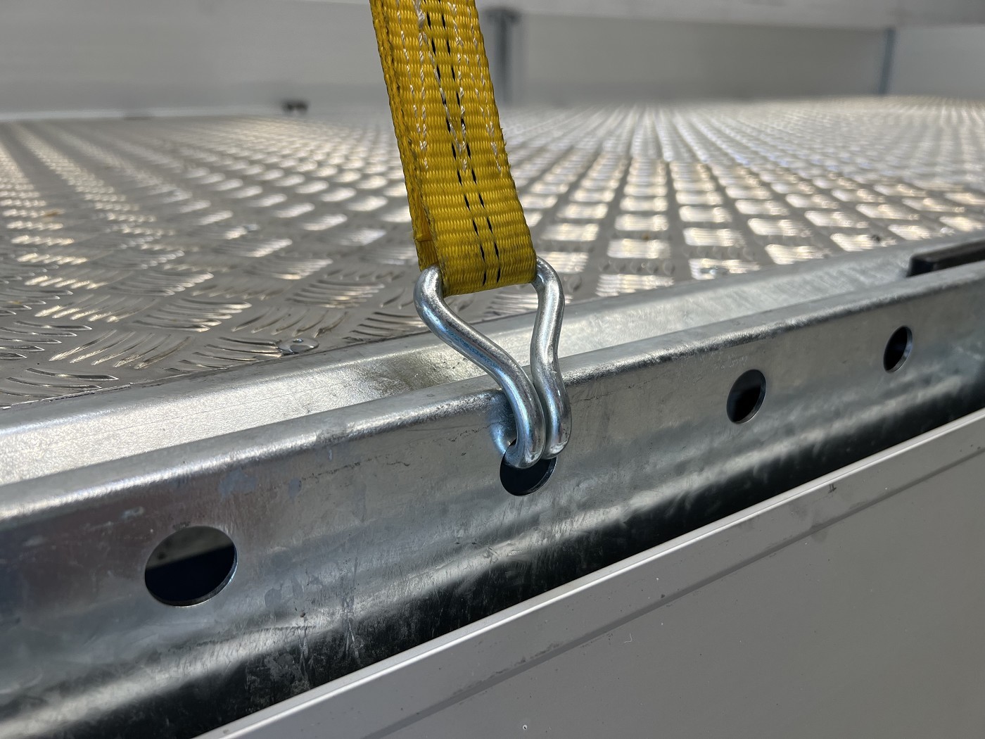 20 bodenbündige, stabile, gummiüberzogene und klapperfreie Verzurrpunkte (10 pro Seite) seitlich im V-Profil eingelassen